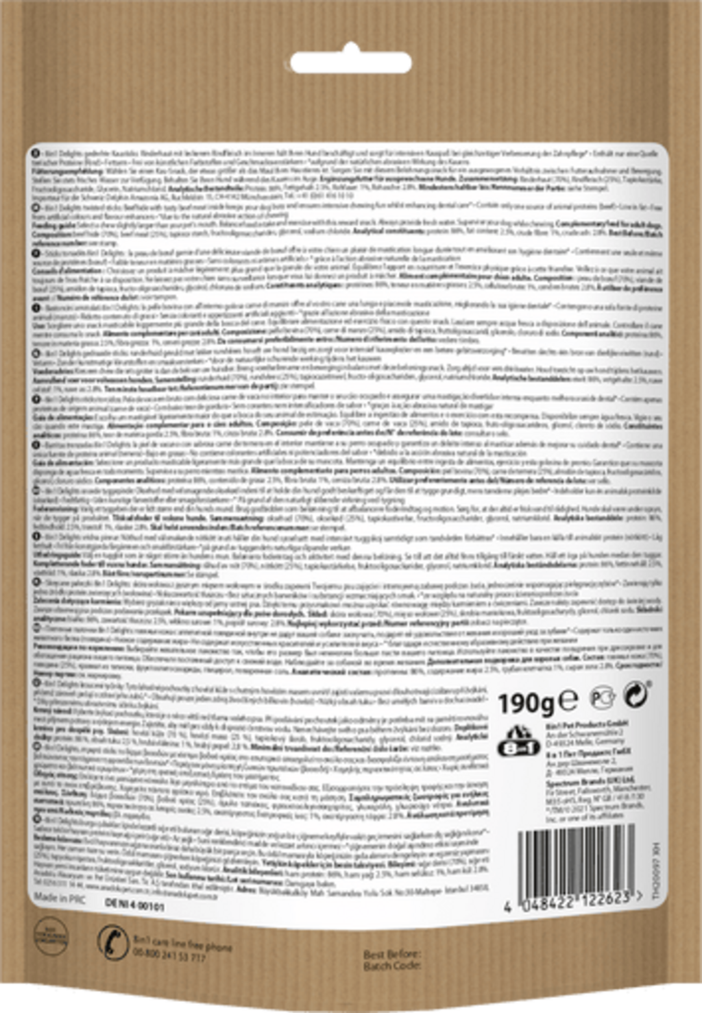 The Delights Beef Twisted Sticks by 8in1 are not only a tasty but also a nutritious reward! These sticks are perfect as a snack in between meals - they also satisfy dogs' chewing instincts. Regular chewing helps to train your dog's jaw muscles and naturally removes tartar, providing long-term support for your pet's dental health!