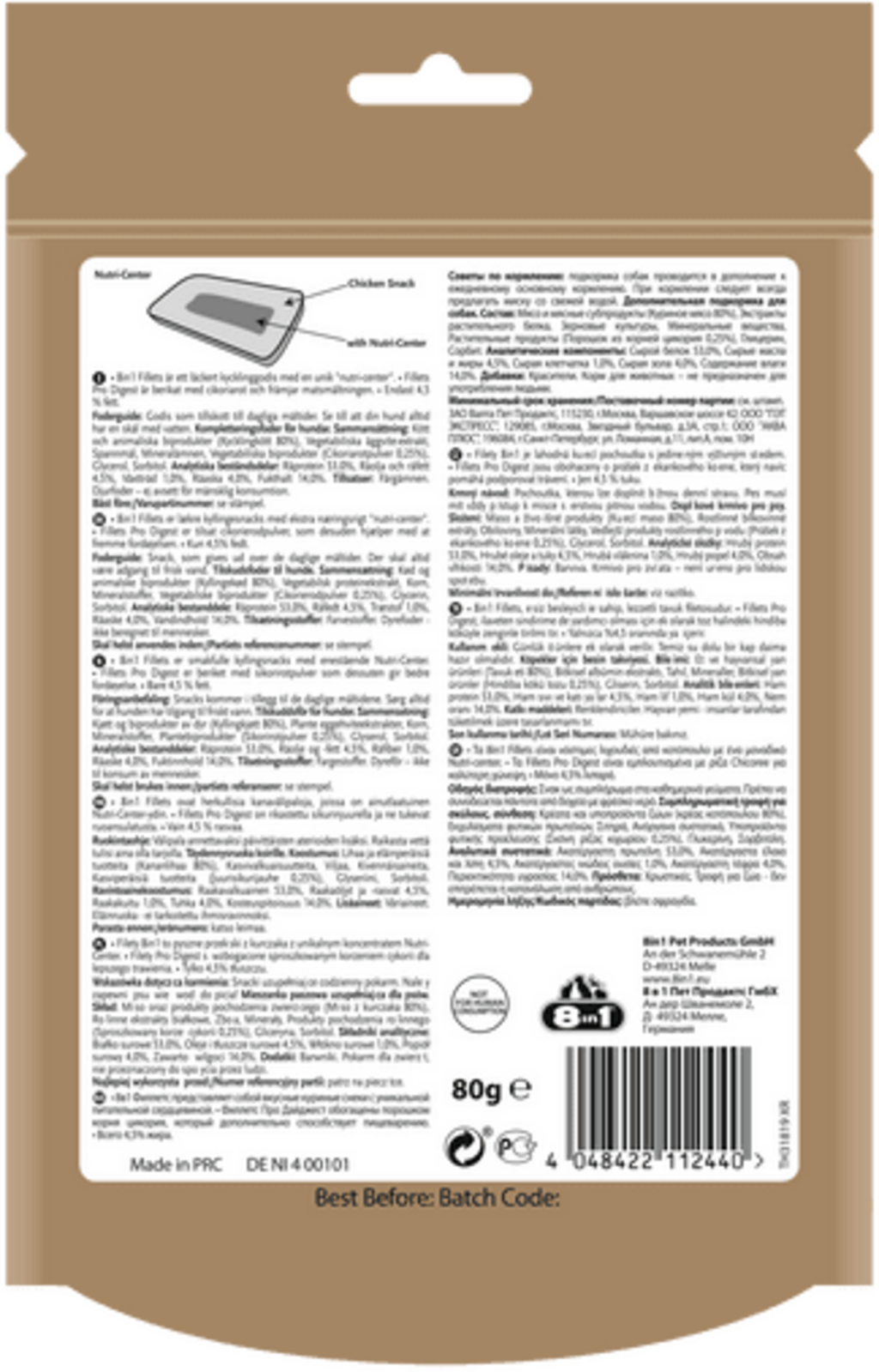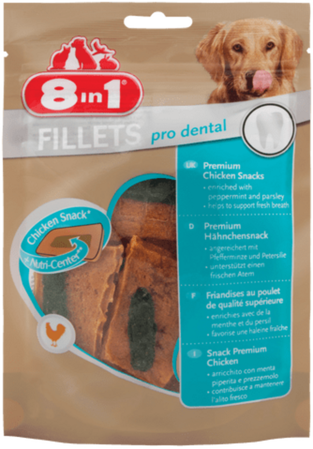 If you were to ask your pet what delights its palate the most, its nose would surely point towards 8in1 Fillets Pro Dental! These tasty pieces are an exceptional premium snack made from delicious chicken meat, providing fresh breath for your sweet dog. The snack is enhanced with a special nutrient core containing peppermint and parsley seeds, known for their healthy properties that promote dog vitality and refresh their breath. With only 4.5% fat content, it's perfect as a varied treat and a supplement to conventional pet food.