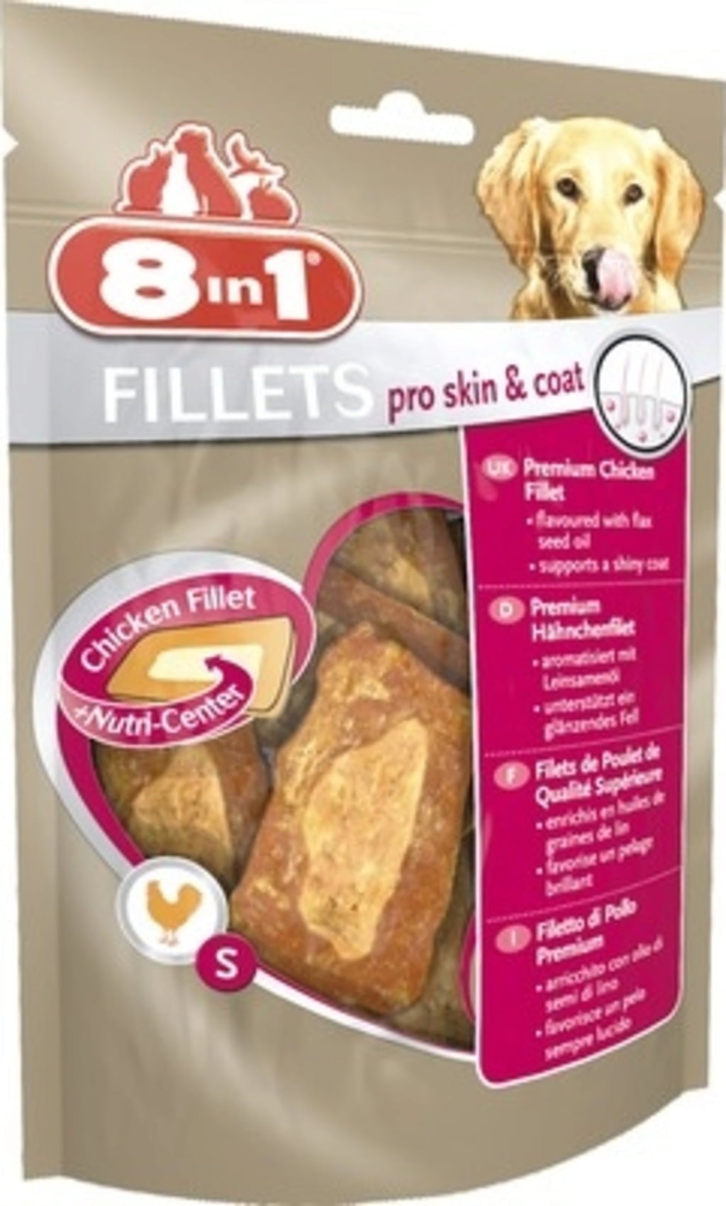 In some cases, the main reason for a dull coat and flaky skin can be a lack of variety in diet. With the delicious 8in1 Fillets Pro Skin & Coat, you get an exceptional premium snack made from tasty chicken meat, perfect for a smooth and shiny coat for your beloved dog! The snack is enhanced with a special nutrient core of linseed oil, which consists of 80 to 90% high-quality Omega-3 fatty acids, offering positive effects on the vitality, coat, and skin of dogs. This varied snack with only 5% fat is ideal as a supplement to regular pet food.