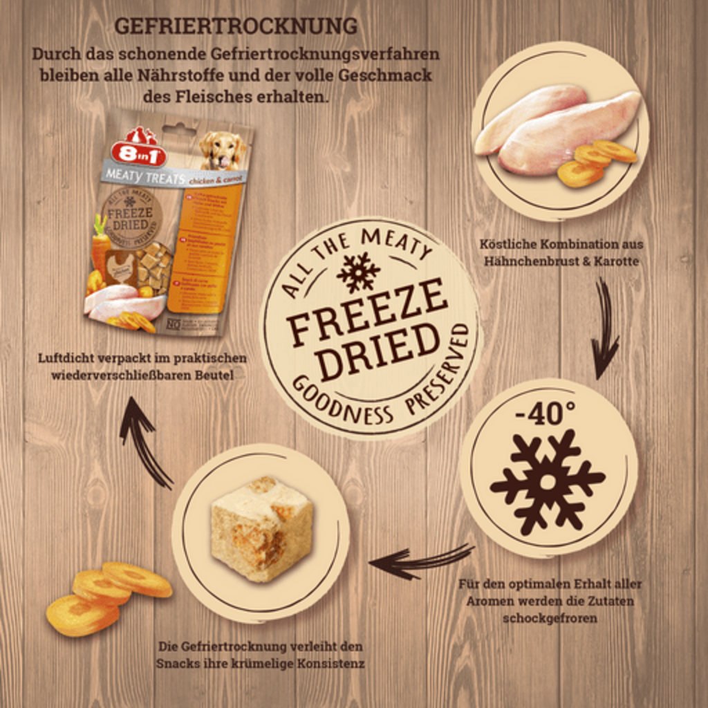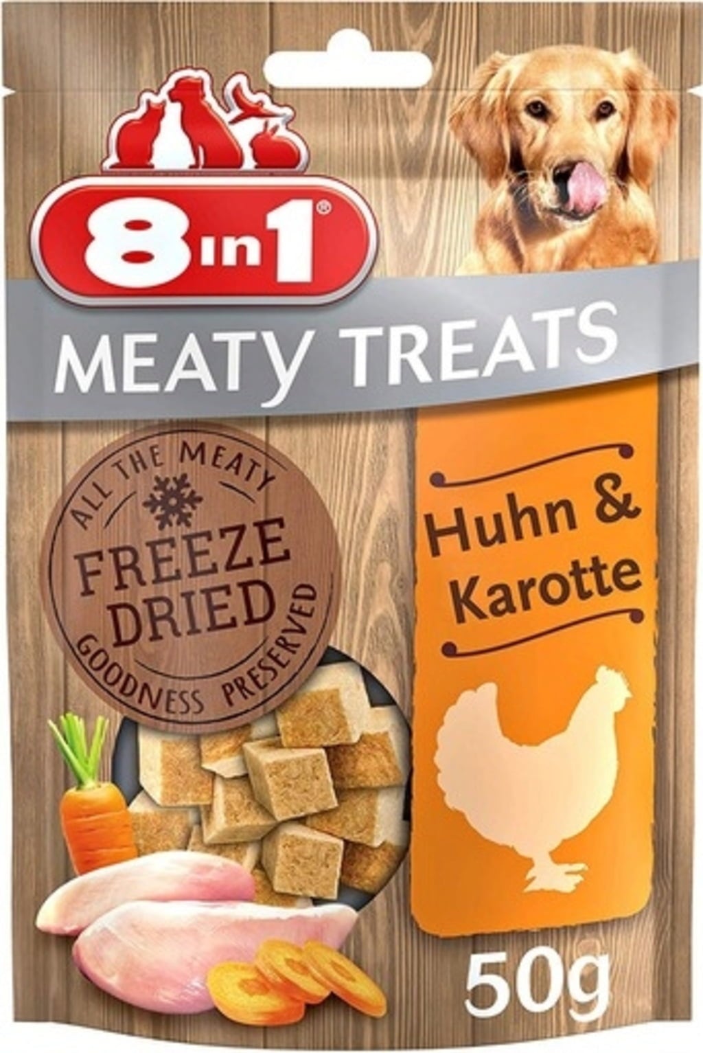 Rewards are essential for good behaviour! The 8in1 Meaty Treats with Chicken and Carrot are delicious snacks that not only pamper your dog's palate but also serve as excellent rewards for task completion! Made from chicken meat and carrot, these freeze-dried snacks retain the full flavour and nutrients of tasty chicken breast. These low-fat treats are high in protein and free from sugar, artificial colours, additives as well as GMOs. The treats also contain no gluten or grains.