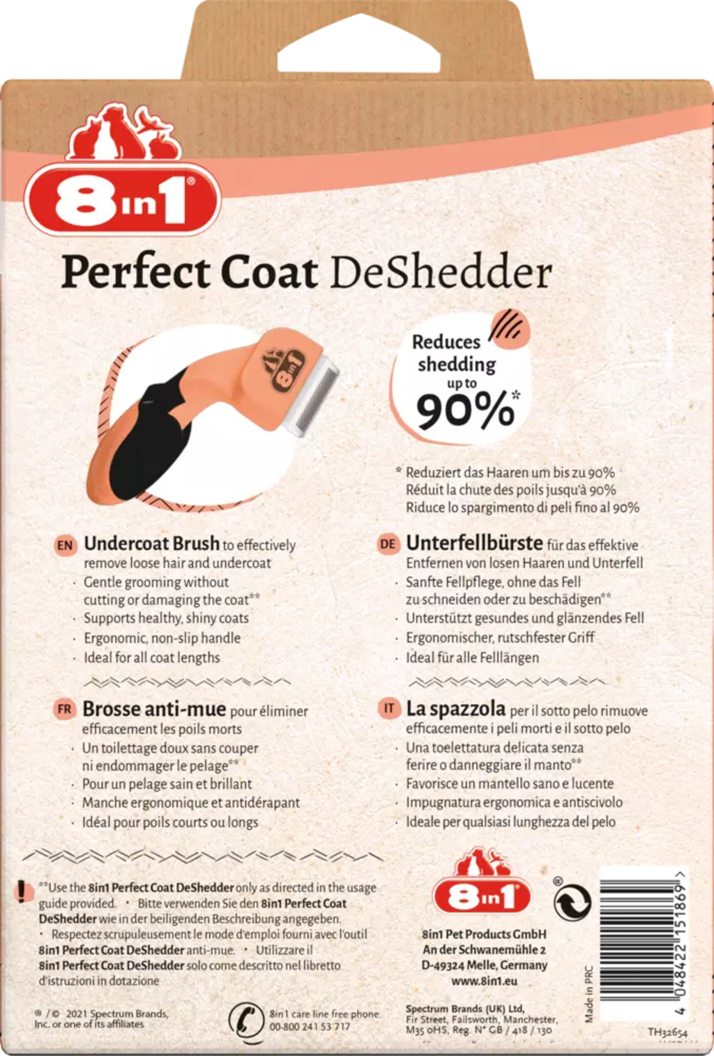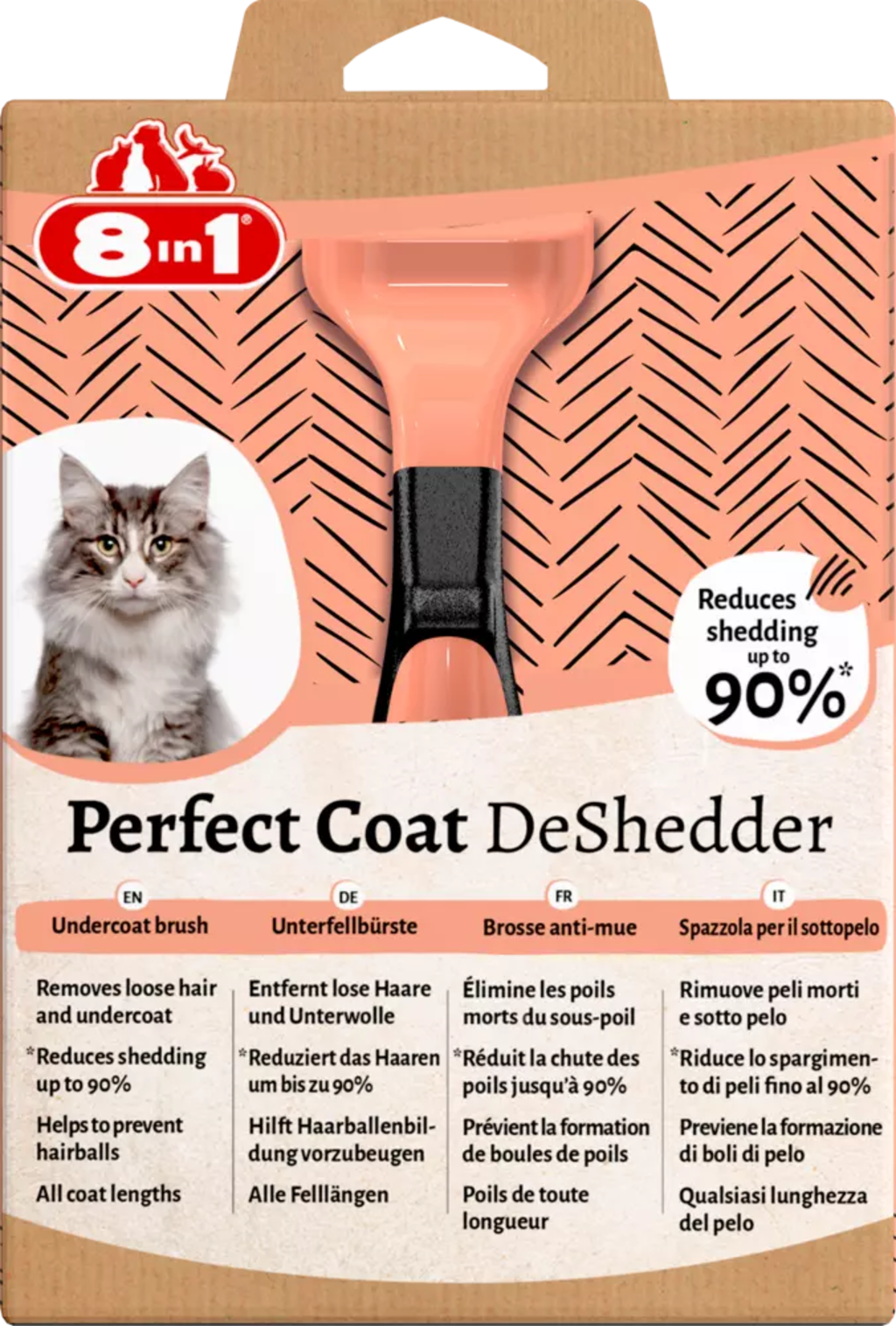 The Perfect Coat DeShedder by 8in1 is an undercoat brush designed for the grooming of shedding cats with any coat length. While it effectively removes loose hair and undercoat, it also ensures glossy hair and can reduce shedding by up to 90%. The gentle brushing also helps to prevent hairballs sustainably - without damaging the fur!