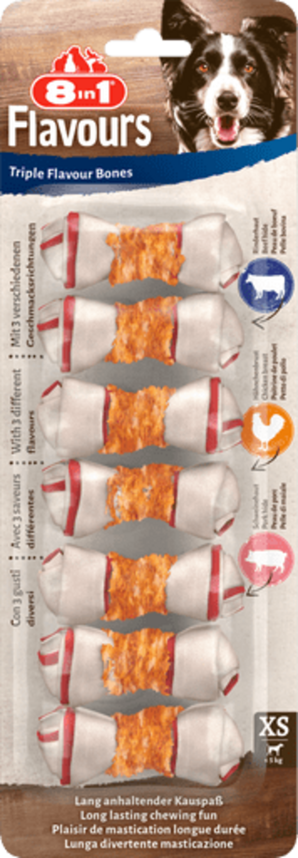 The nutrient-rich Triple Flavour Bones by 8in1 are a delicious treat for a true explosion of taste! They combine three distinctly tasty flavours of pig and beef hide, wrapped in tender, juicy chicken breast.
