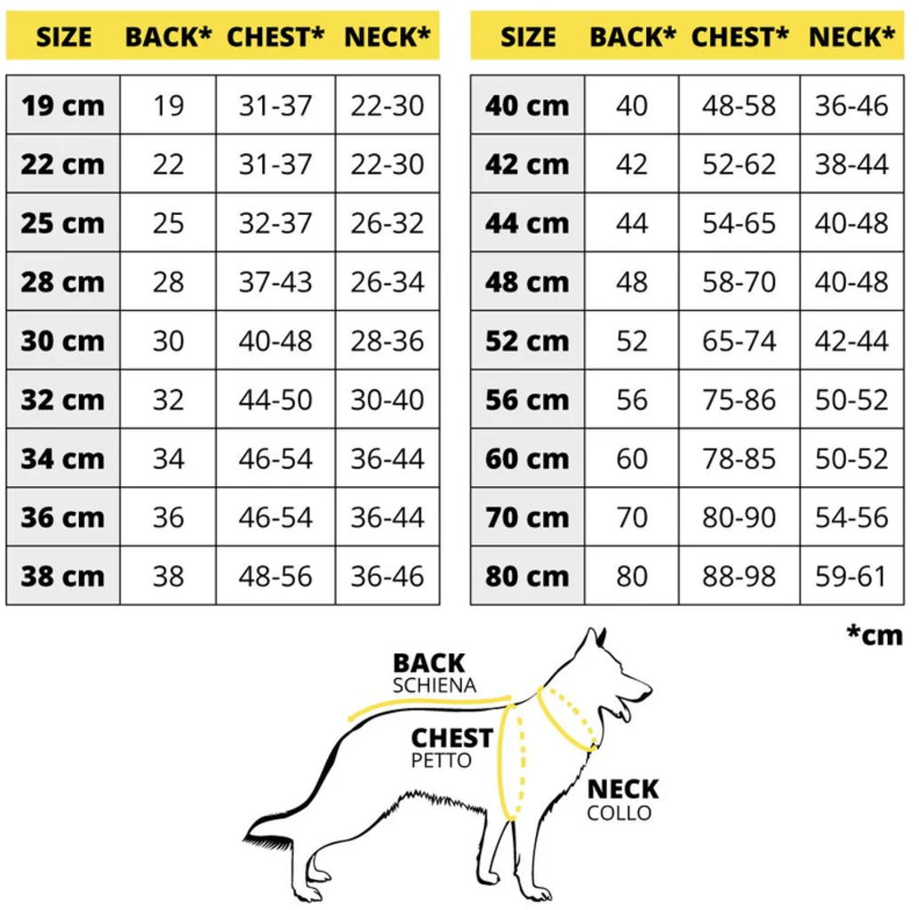 The size specifications correspond to the dog's back length: e.g., XS28 = 28 cm back length