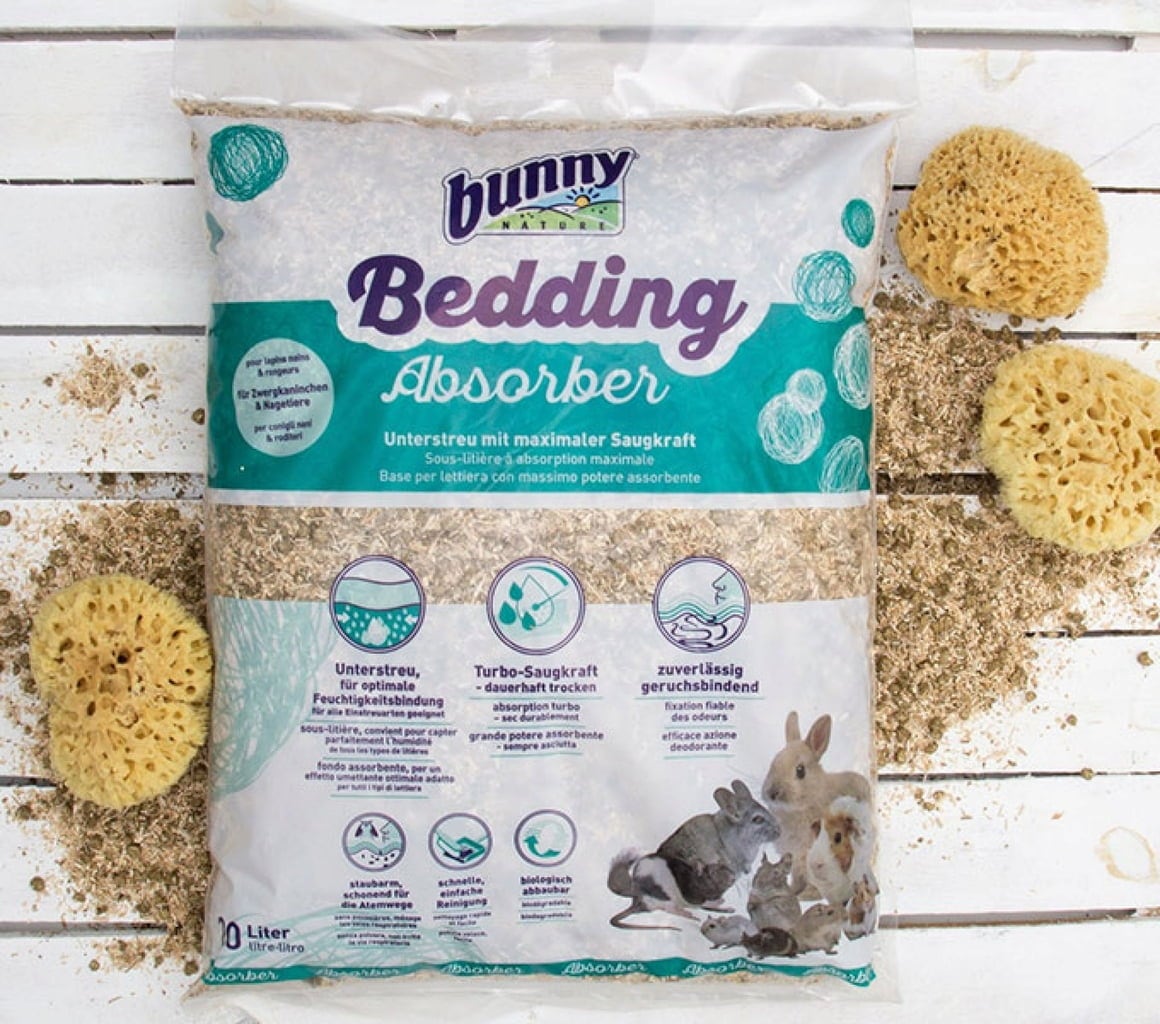 - Place bunnyBedding Absorber at least 2 cm thick on the cage base and scatter bedding of your choice over it.