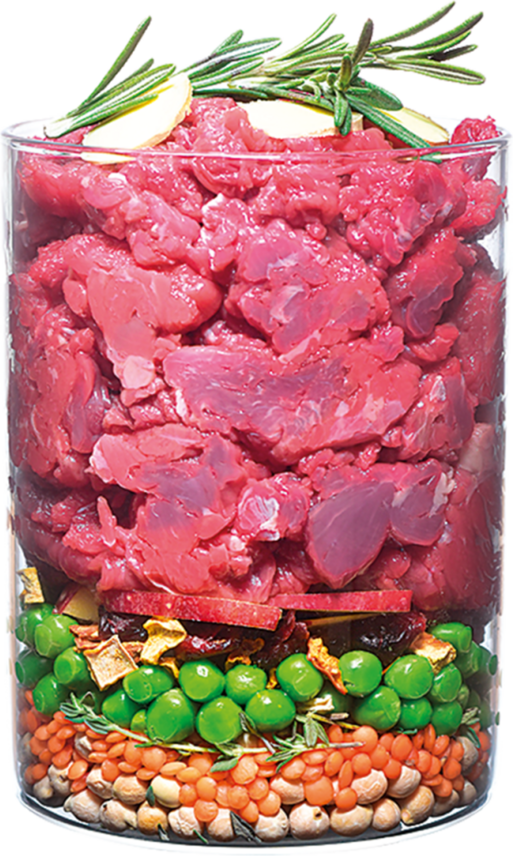 60 % Fresh beef, Peas, Beef fat (Preserved with tocopherols), 4 % Pumpkin, Chickpeas, Dried apples, Red lentils, Natural flavours, 1 % Salmon oil, Carrots, Dried eggshells, 0,5 % Lemna protein, 0,3 % Spirulina, 0,2 % Dried sea buckthorn, 0,1 % Dried ginger root, 0,1 % Dried blueberries, 0,1 % Dried rosemary, 0,1 % Dried cranberries, 0,1 % Dried thyme, 0,026 % Glucosamine, 0,025 % Green-lipped mussels, 0,016 % Chondroitin sulfate, Beer yeast (0,015 % Source of mannan-oligosaccharides), Chicory root (0,01 % Source of fructo-oligosaccharides), 0,01 % Mojave yucca