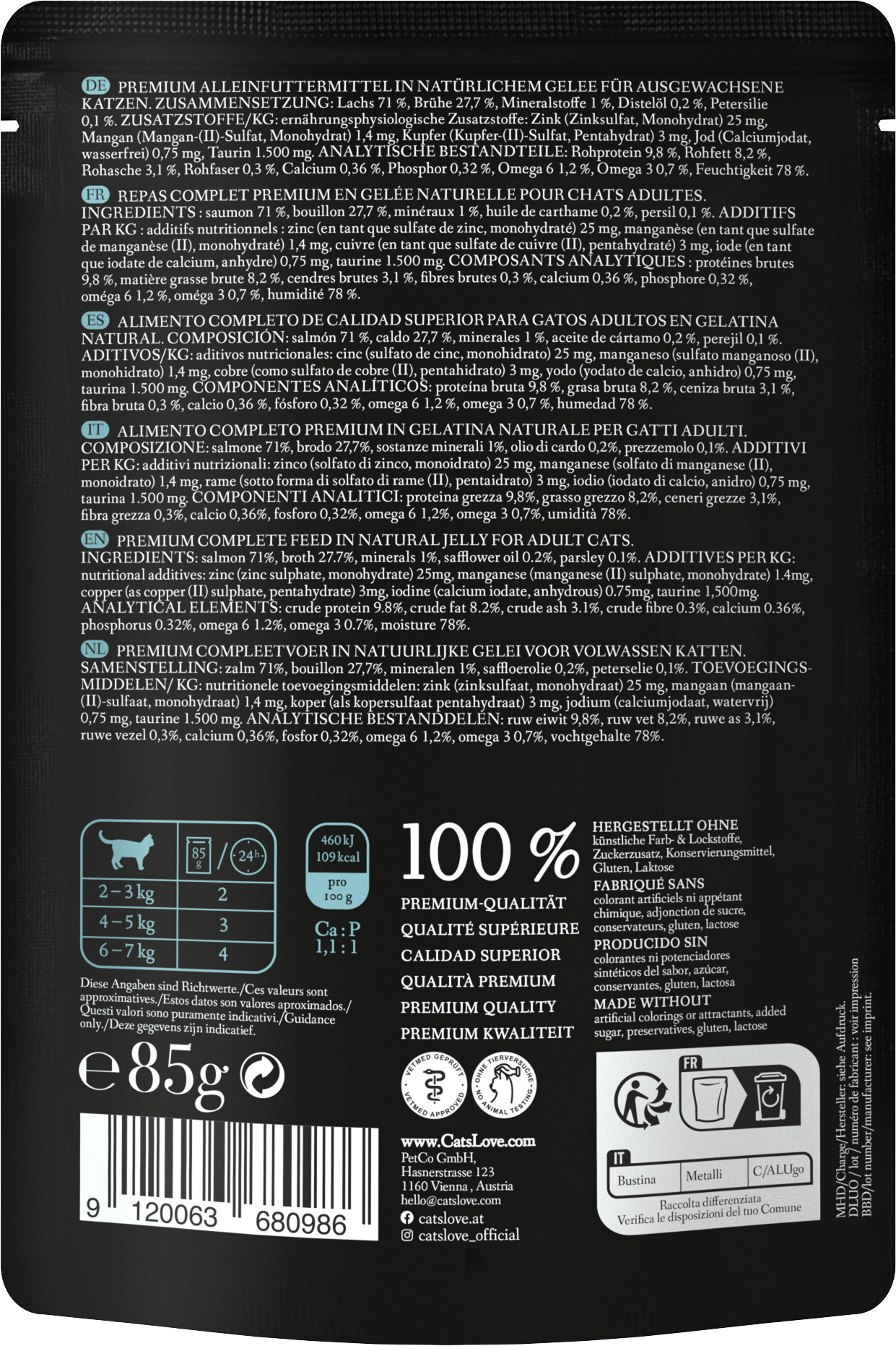 With an impressive meat content of 71%, this delicious single-protein wet pet food is rich in finest salmon, providing your cat with high-quality protein, omega-3 fatty acids, and iodine. It is enhanced with safflower oil and parsley while consistently avoiding added sugar, grains, gluten, lactose, and artificial preservatives or attractants.