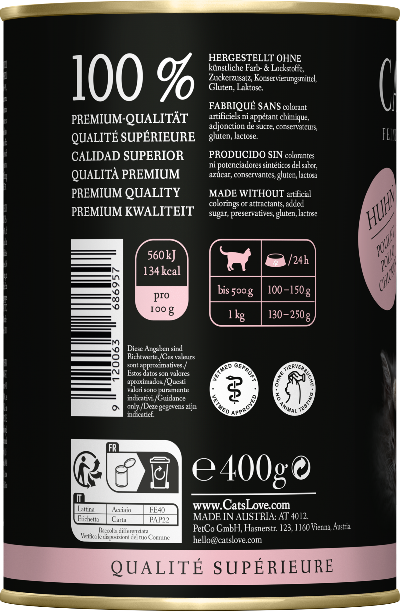 With a 92% meat content derived from tender chicken, this premium treat guarantees the highest quality and a flavour your kitten will simply adore. The delicious paté with tender calf is served without artificial preservatives or attractants.