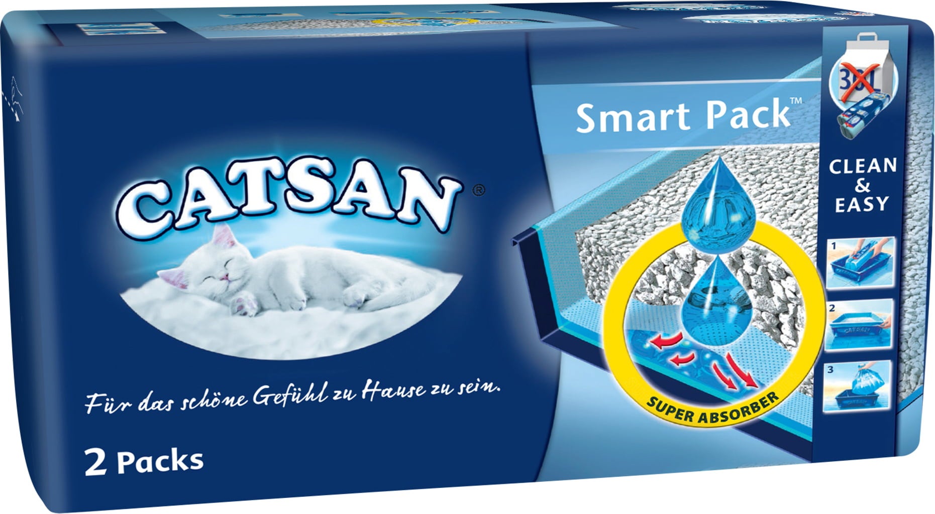 To makes cleaning out the litter box easier, Catsan has developed the unique Smart Pack 2x4 L. These are two practical and ready-to-use litter box insert packs that protect the litter box and prevent odours and soiling.