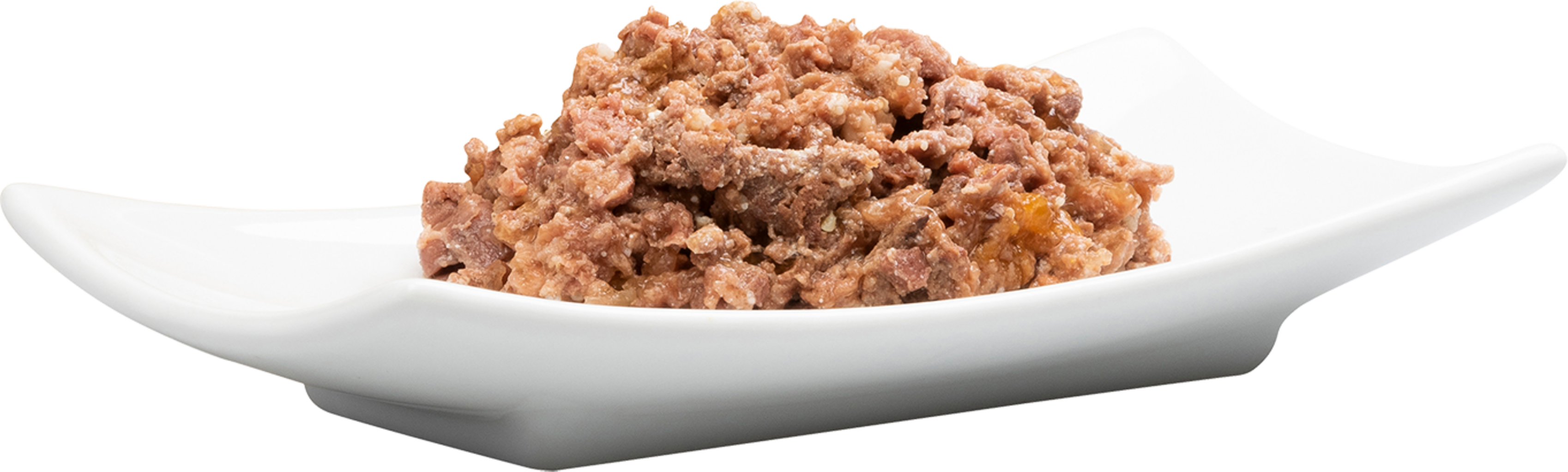 50 % Beef (Heart, Muscle meat, Liver, Lung), 26,6 % Beef and veal broth, 20 % Veal (Heart, Muscle meat, Liver, Lung), 1 % Apricot, 1 % Pineapple, 1 % Minerals, 0,15 % Linseed oil, 0,15 % Salmon oil, 0,1 % Seaweed