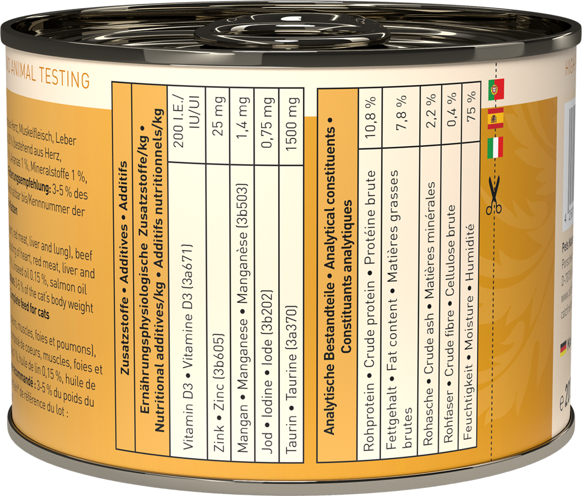 With this premium wet pet food, you can treat your cat to something truly special and indulge them with selected natural ingredients of outstanding quality and exquisite taste. Formulated following the prey concept, this pet food respects the nature of your cat, bringing a touch of original quality of life back.