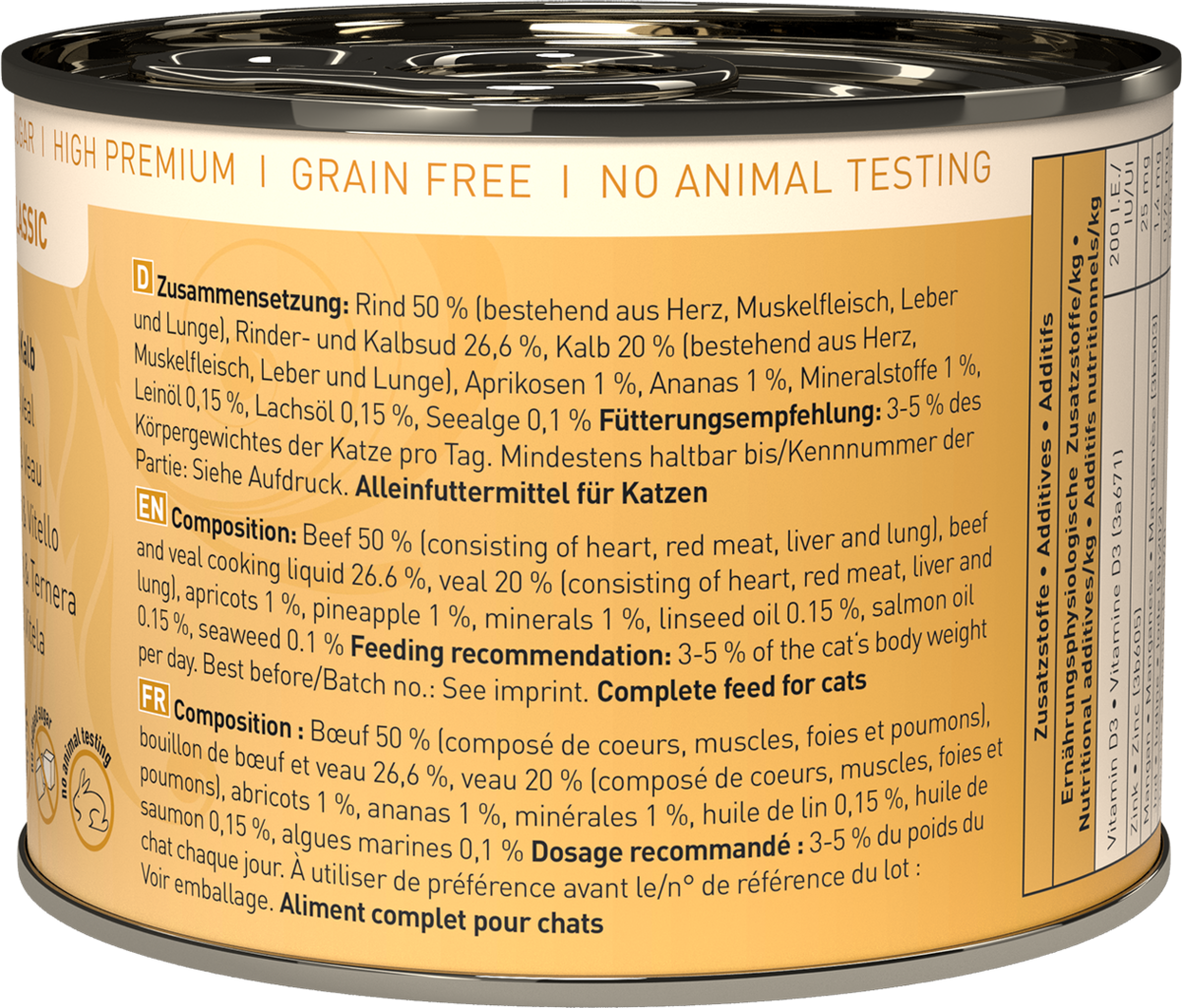50 % Beef (Heart, Muscle meat, Liver, Lung), 26,6 % Beef and veal broth, 20 % Veal (Heart, Muscle meat, Liver, Lung), 1 % Apricot, 1 % Pineapple, 1 % Minerals, 0,15 % Linseed oil, 0,15 % Salmon oil, 0,1 % Seaweed