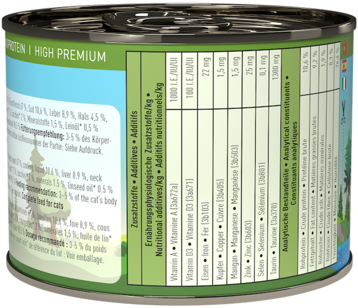 This high-quality monoprotein wet food in organic quality offers your cat a natural and species-appropriate mealtime experience. Carefully selected organic ingredients and a special recipe based on the whole-prey concept provide your cat with everything it needs, forming a fundamental basis for a vital and healthy life.