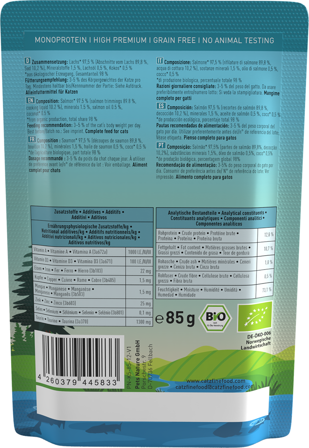 This high-quality monoprotein wet pet food in organic quality offers your cat a natural and species-appropriate taste experience. Selected organic ingredients and a special recipe inspired by the prey concept provide your cat with everything it needs, thus contributing significantly to a vital feline life.