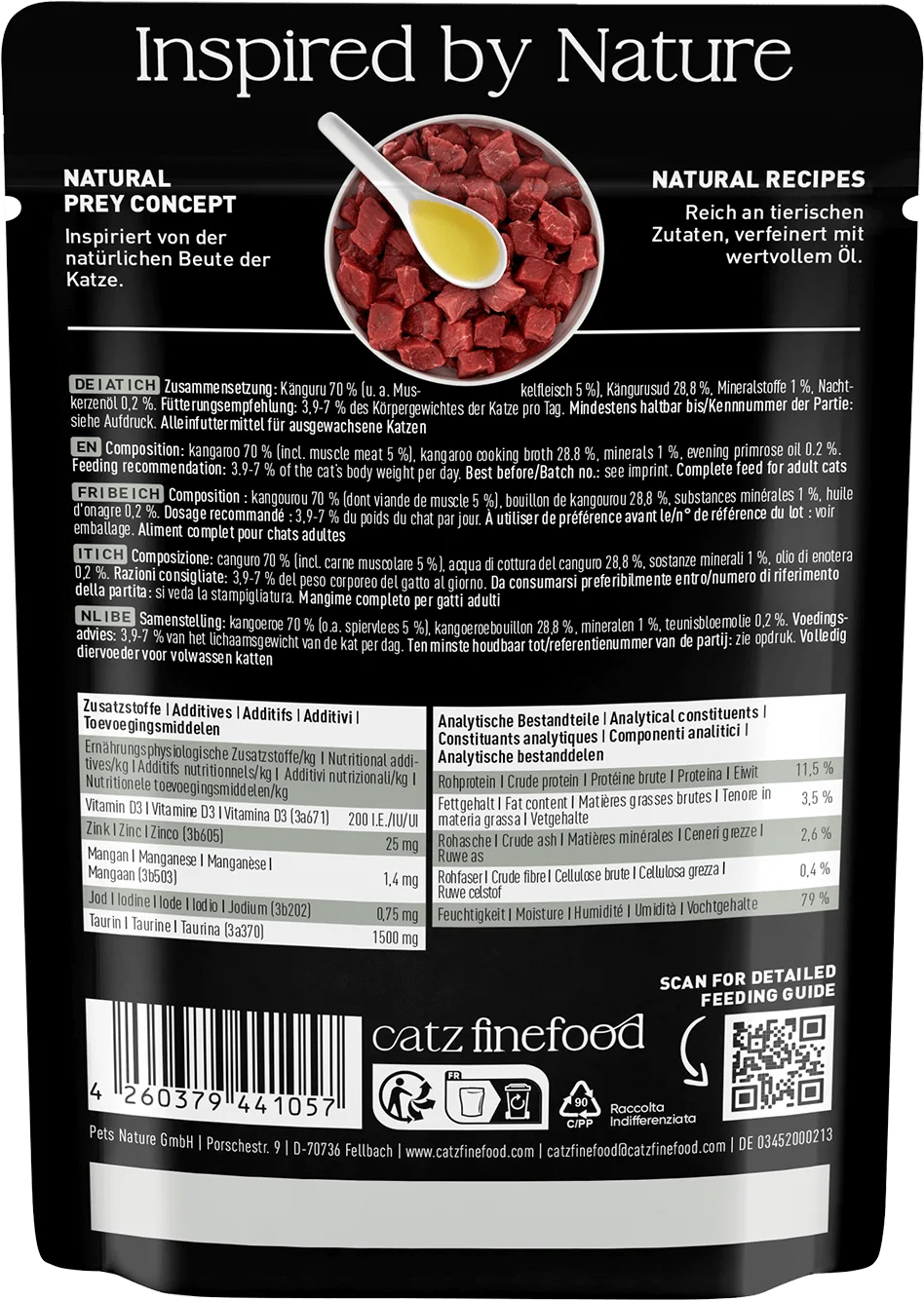 This delicious premium wet food is guaranteed to get your cat purring. Carefully selected ingredients, a species-appropriate recipe based on the prey concept and free from any unnecessary extras, pure enjoyment for your cat and an excellent foundation for an active life.