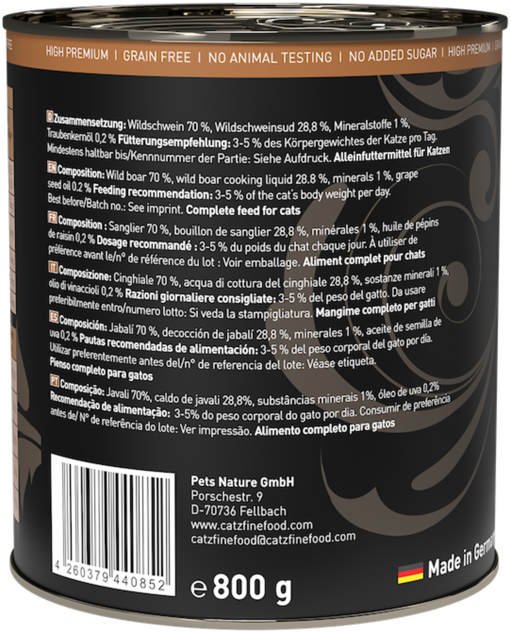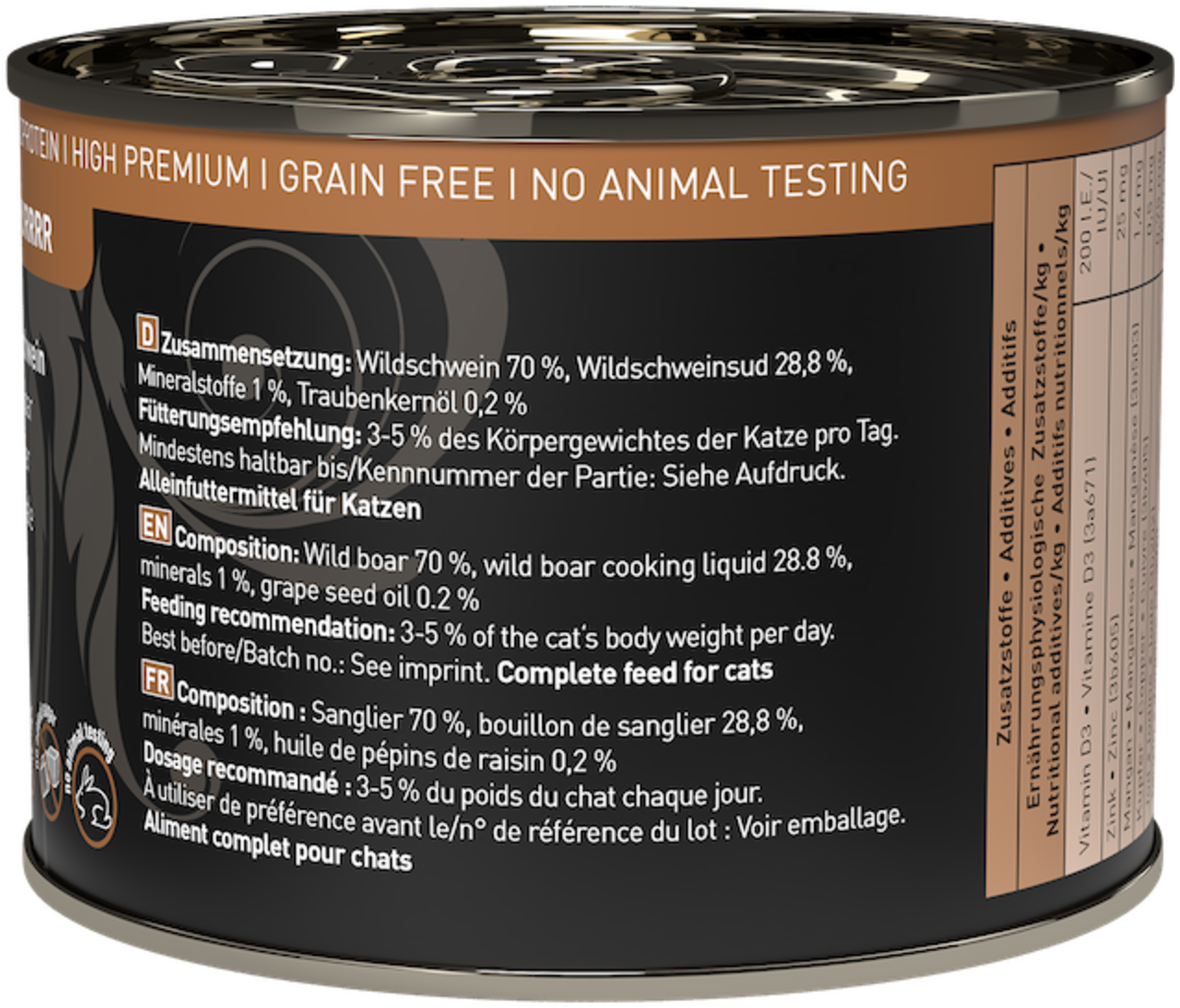 70 % Wild boar, 28,8 % Wild boar broth, 1 % Minerals, 0,2 % Grape seed oil