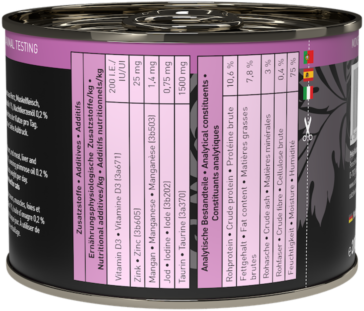 This delicious premium wet food is guaranteed to get your cat purring. Carefully selected ingredients, a species-appropriate recipe based on the prey concept and free from any unnecessary extras – pure enjoyment for your cat and an excellent foundation for an active life.