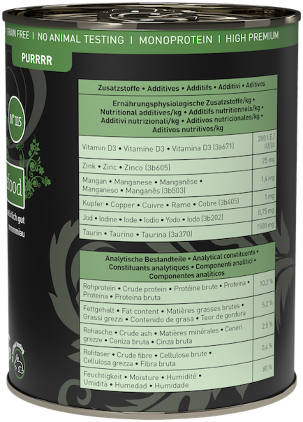 | Product Properties: | Non-GMO, Free from flavour enhancers, Free from bone and meat meal, Preservative-free, Free from artificial colours, Free from artificial colours and attractants, Free from artificial flavours, Free from added sugar, Grain-free, Gluten-free, Monoprotein, Free from animal testing |