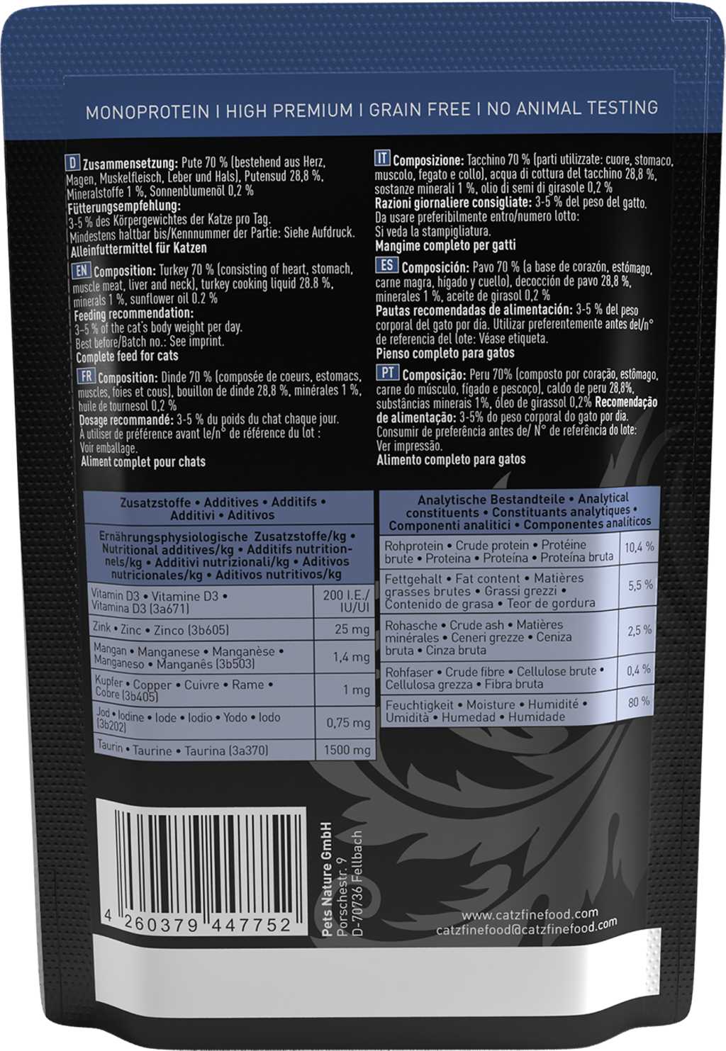 70 % Turkey (Heart, Stomach, Muscle meat, Liver, Neck), 28,8 % Turkey broth, 1 % Minerals, 0,2 % Sunflower oil
