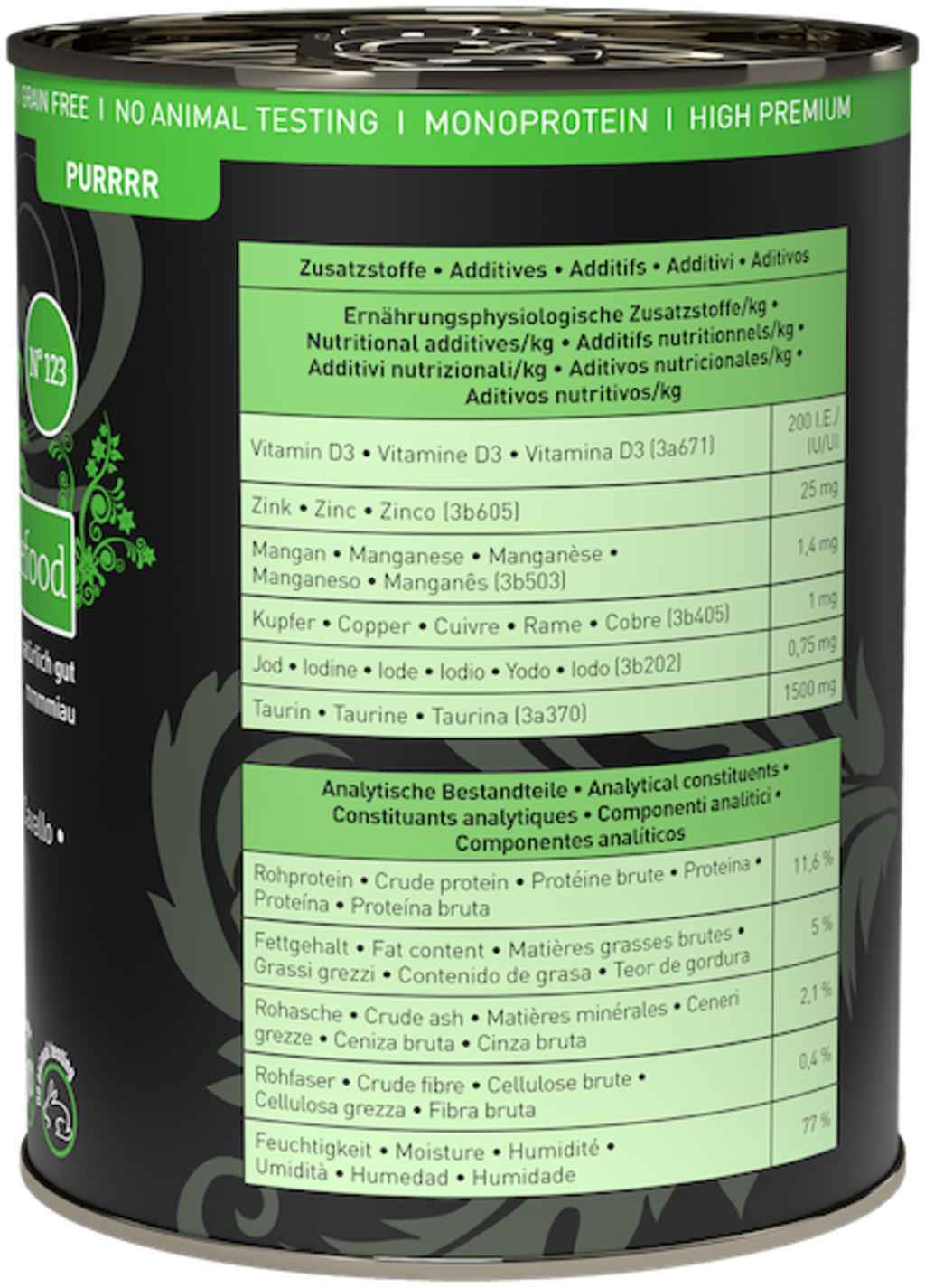 This delicious premium wet food is guaranteed to get your cat purring. Carefully selected ingredients, a species-appropriate recipe based on the prey concept and free from any unnecessary extras – pure enjoyment for your cat and an excellent foundation for an active life.