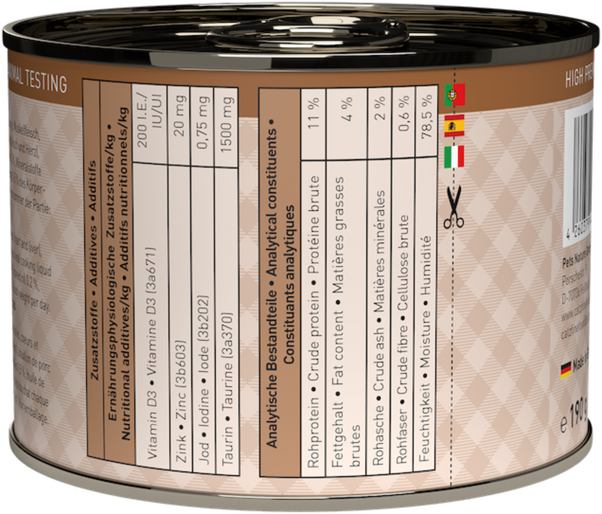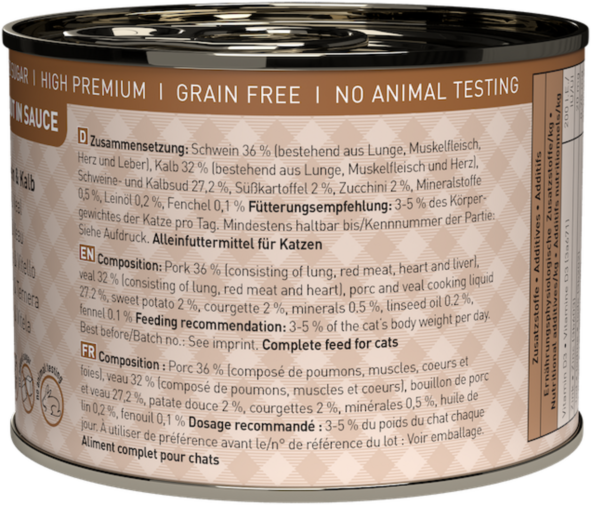 36 % Pork (Lung, Muscle meat, Heart, Liver), 32 % Veal (Lung, Muscle meat, Heart), 27,2 % Pork and veal broth, 2 % Sweet potato, 2 % Zucchini, 0,5 % Minerals, 0,2 % Linseed oil, 0,1 % Fennel