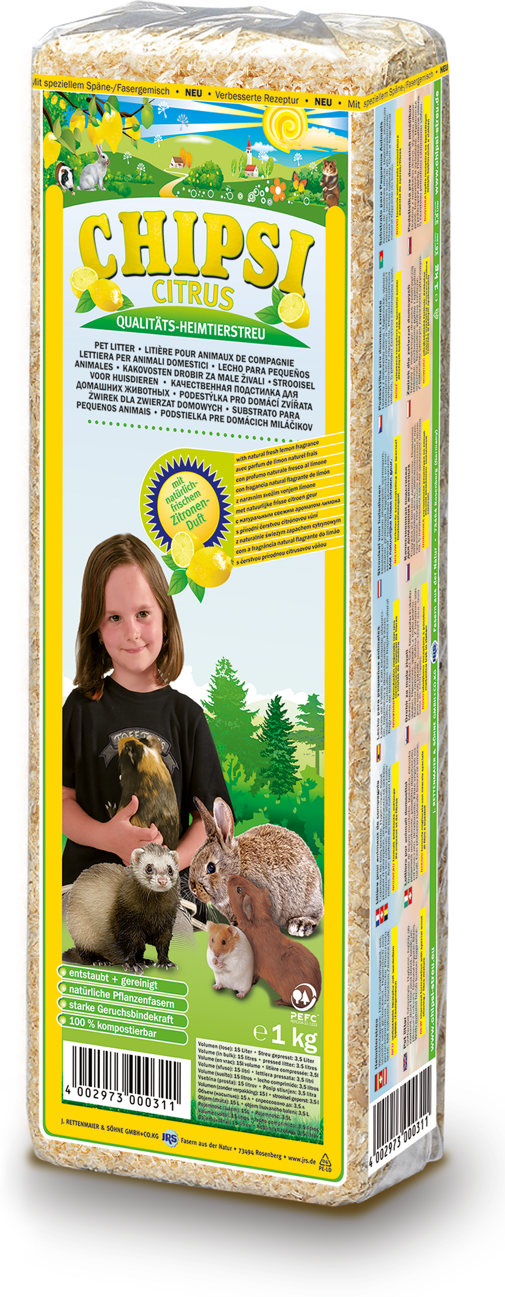 CHIPSI CITRUS is a classic bedding - for rodent cages - with a natural citrus scent. Paw-friendly softwood shavings with a chemical-free guarantee make this product a favourite with both humans and animals. Of course, this purely plant-based basic litter is also dust-free and highly absorbent, has an odour-binding effect and keeps your pet's home pleasantly dry and hygienic.