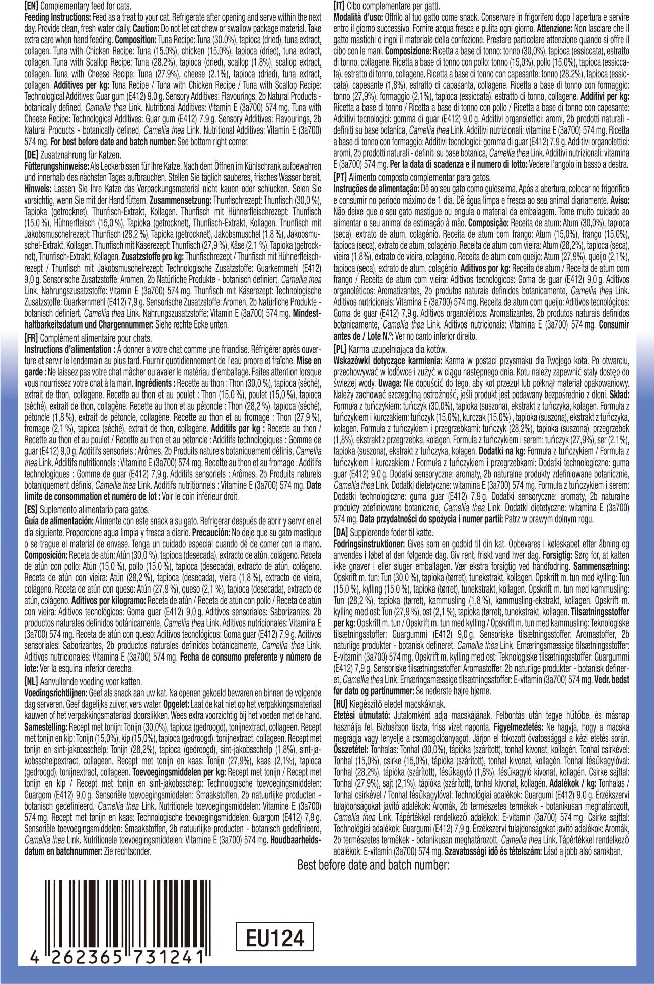 27,9 % Tuna, 2,1 % Cheese, Dried tapioca, Tuna extract, Collagen