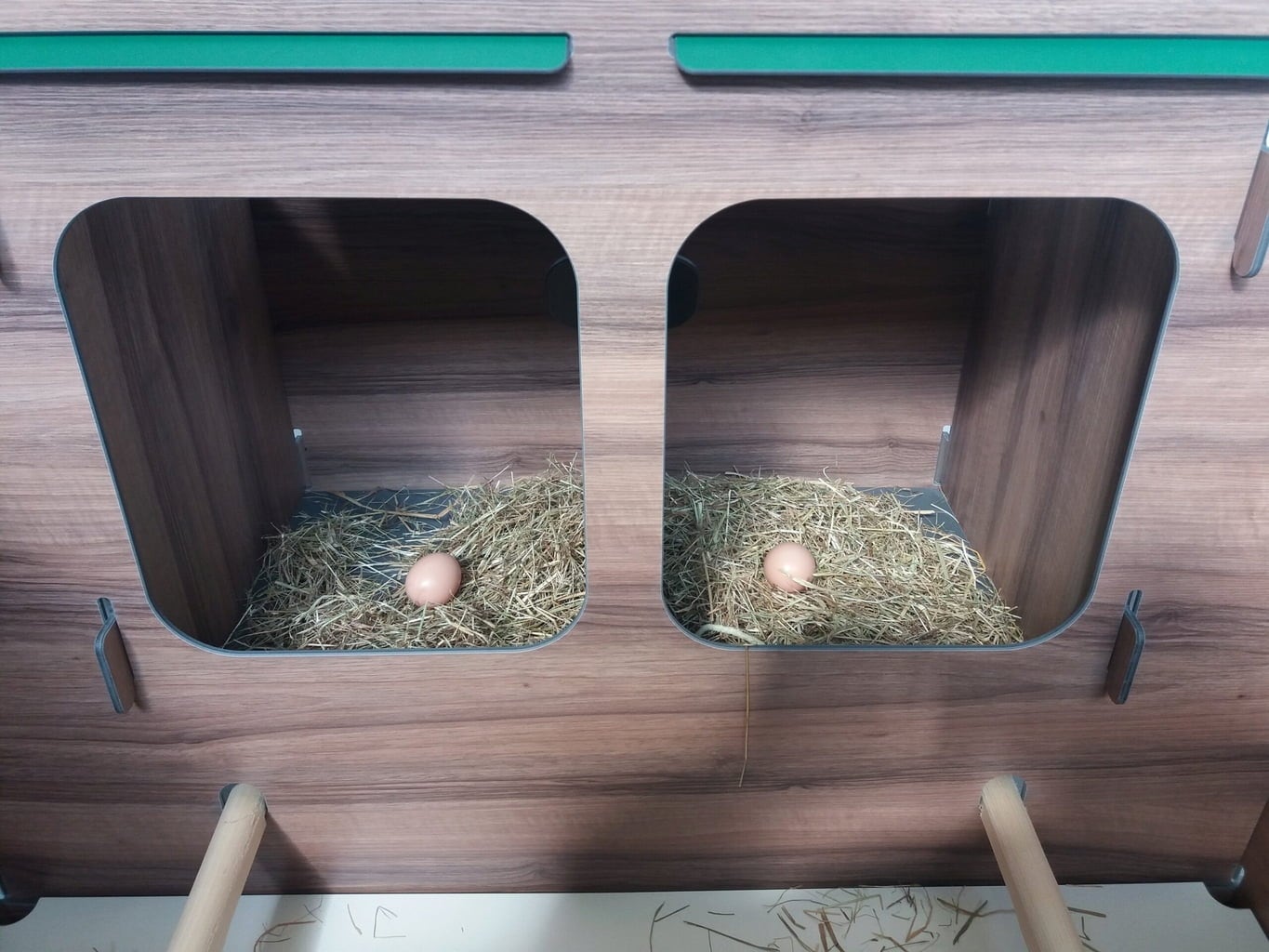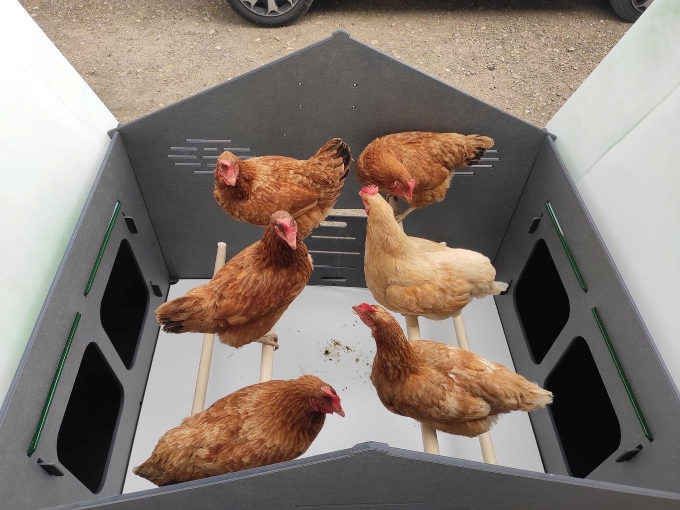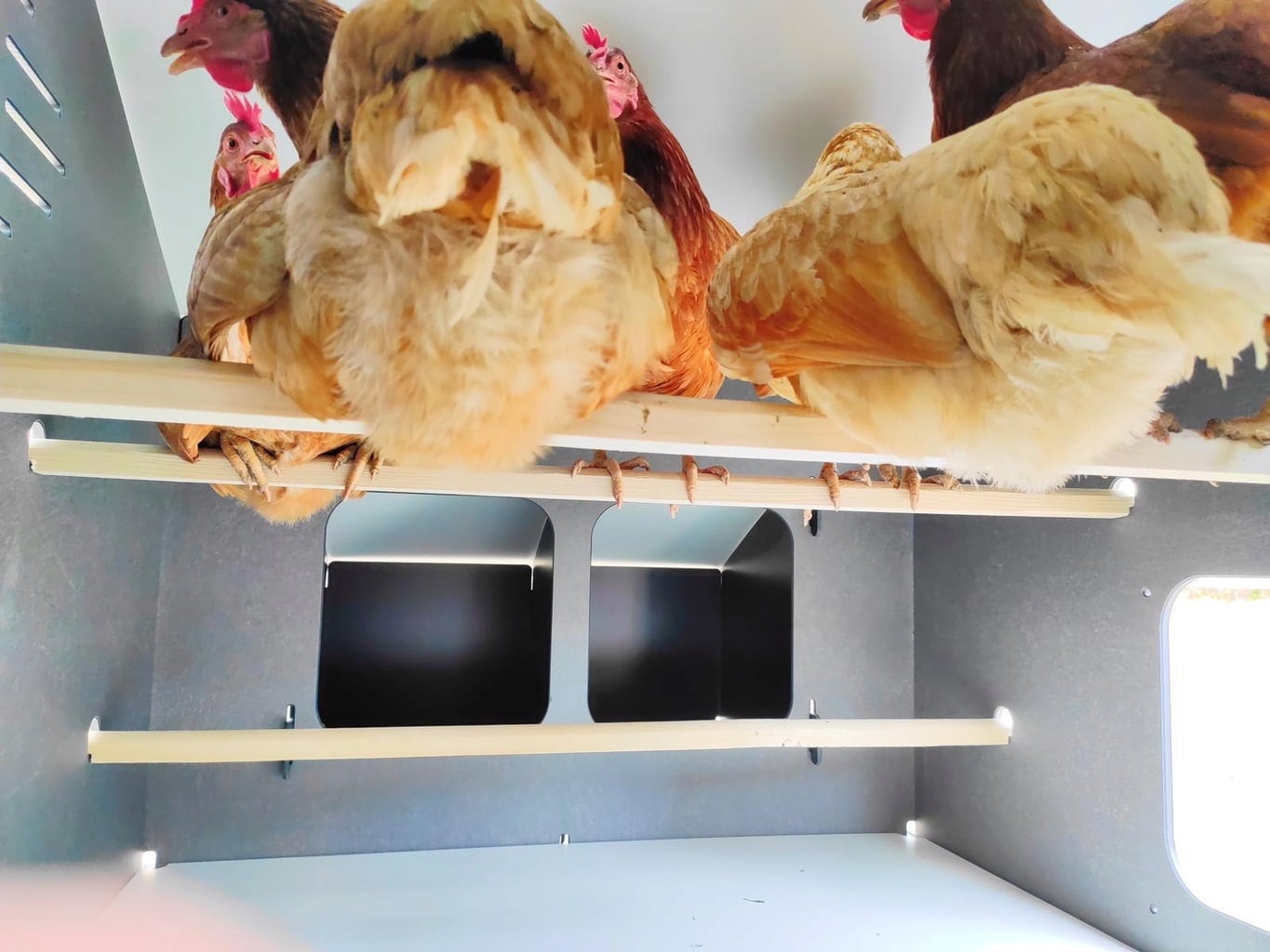 - 4 nests for laying eggs (outside of the coop)