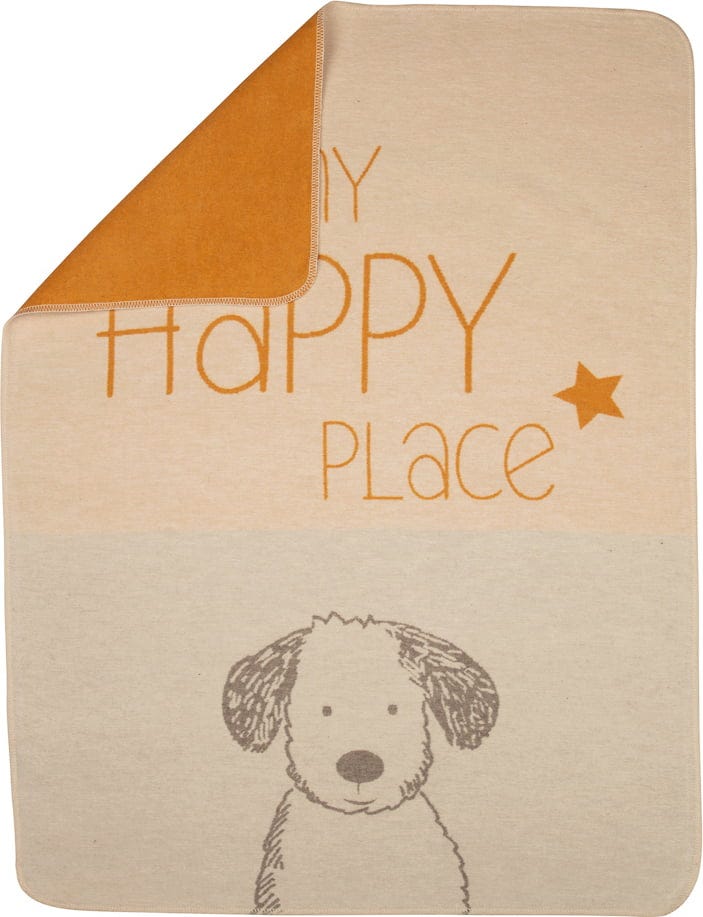 The my happy place dog blanket is made from 85% recycled cotton. The high-quality blanket is easy to clean - machine washable at 40°C.