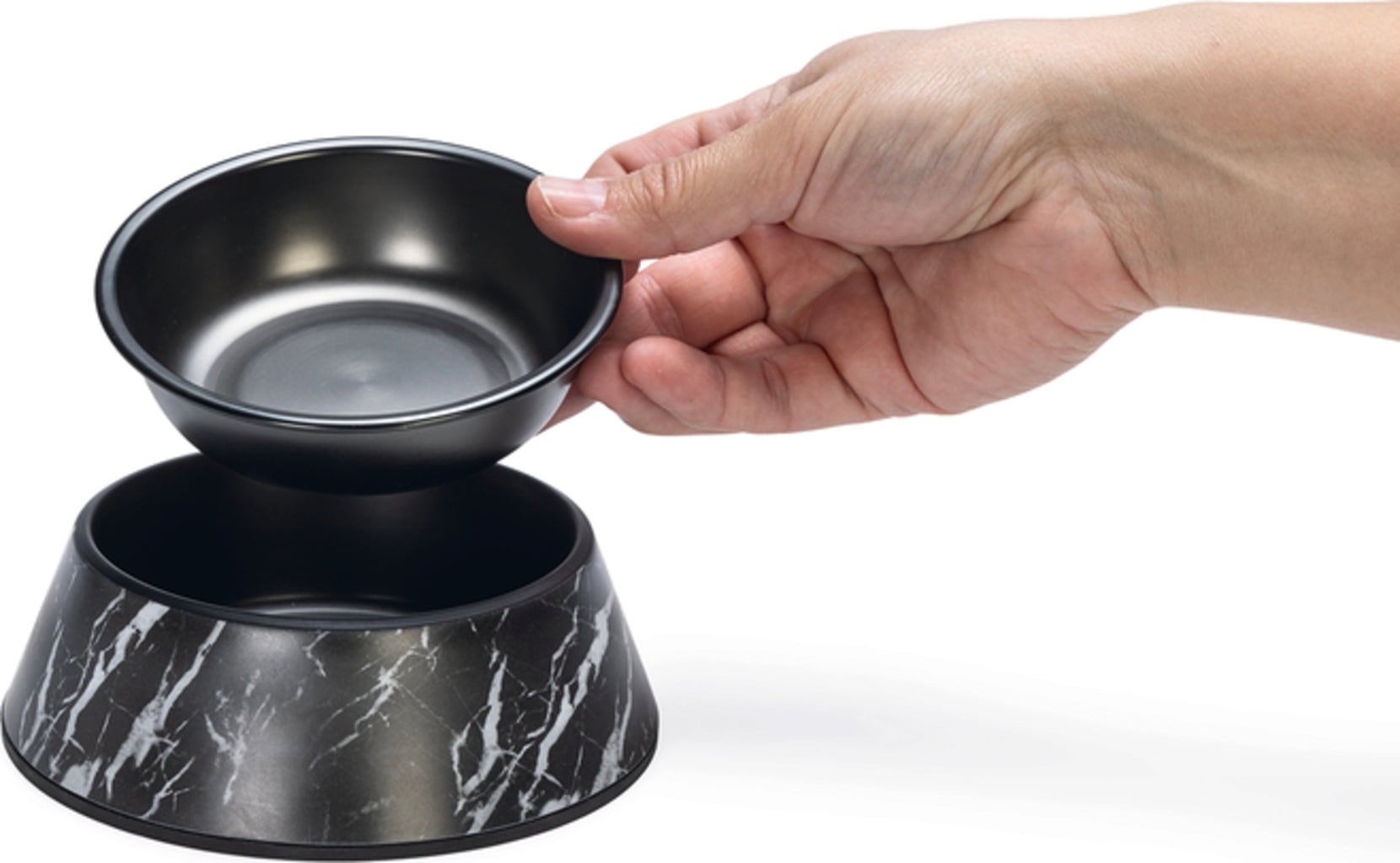 This stylish cat bowl impresses with its luxurious marble look and is a true eye-catcher in any elegant cat household. The removable inner bowl made of matte stainless steel not only looks refined but is also practical and hygienic. The non-slip coating on the underside prevents slipping and ensures the bowl stays where it belongs.