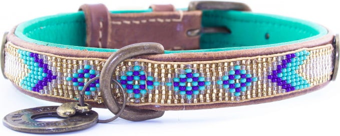 With a turquoise leather lining and beads sewn into the collar, this pretty collar is sure to charm your friends! The gold/turquoise collar definitely makes for a special accessory.