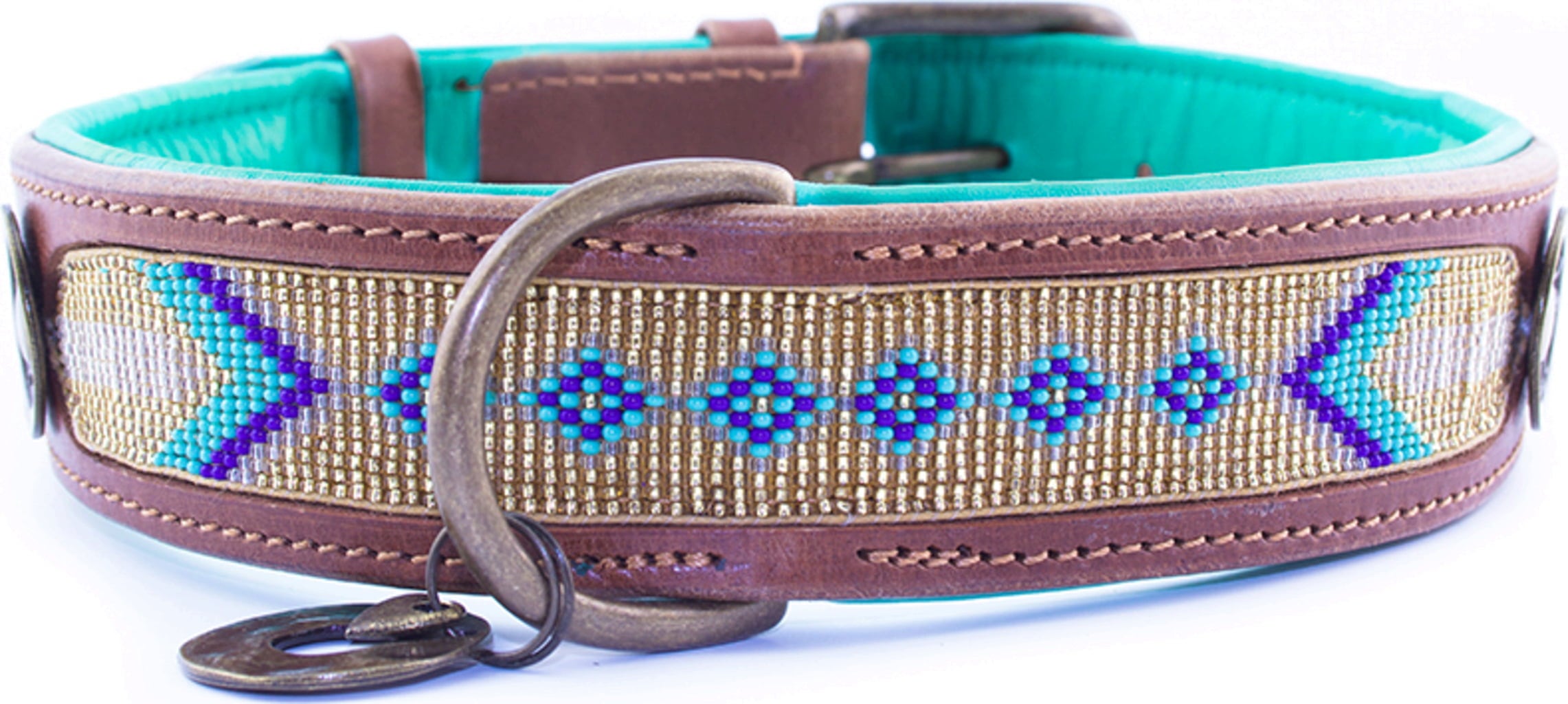This collar is made with soft turquoise leather and inlaid beads in gold and turquoise. Enjoy the beautiful design!