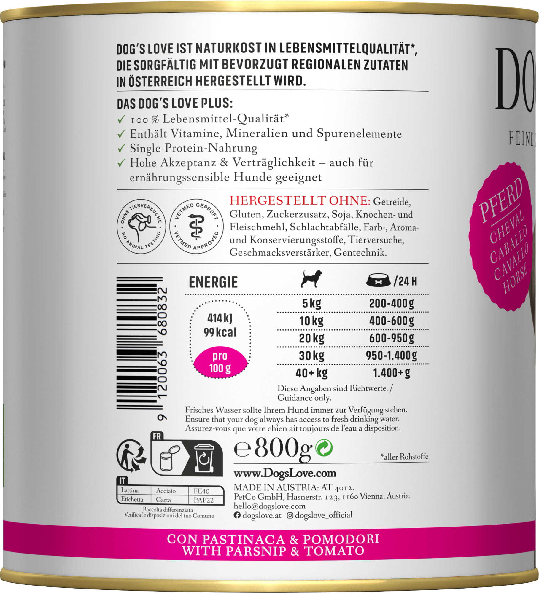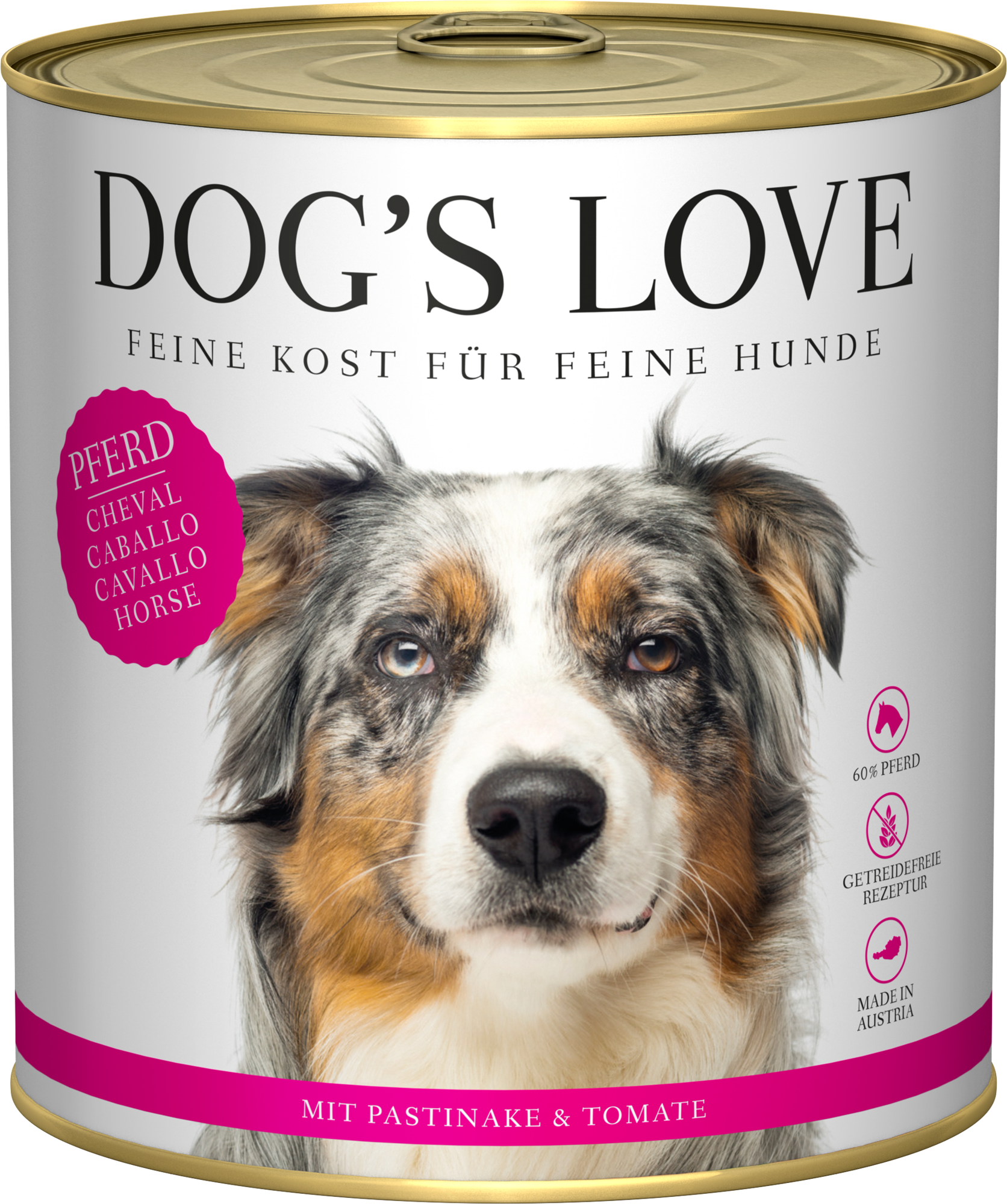 Looking for the perfect gourmet treat for your dog? Then Dog's Love Adult Wet Pet Food is just what you need! Every bite is a symphony of high-quality, carefully selected ingredients that will delight even the most discerning palates. The tender consistency of horse meat (60%) combined with the fresh taste of tomatoes and parsnips makes every meal a feast.