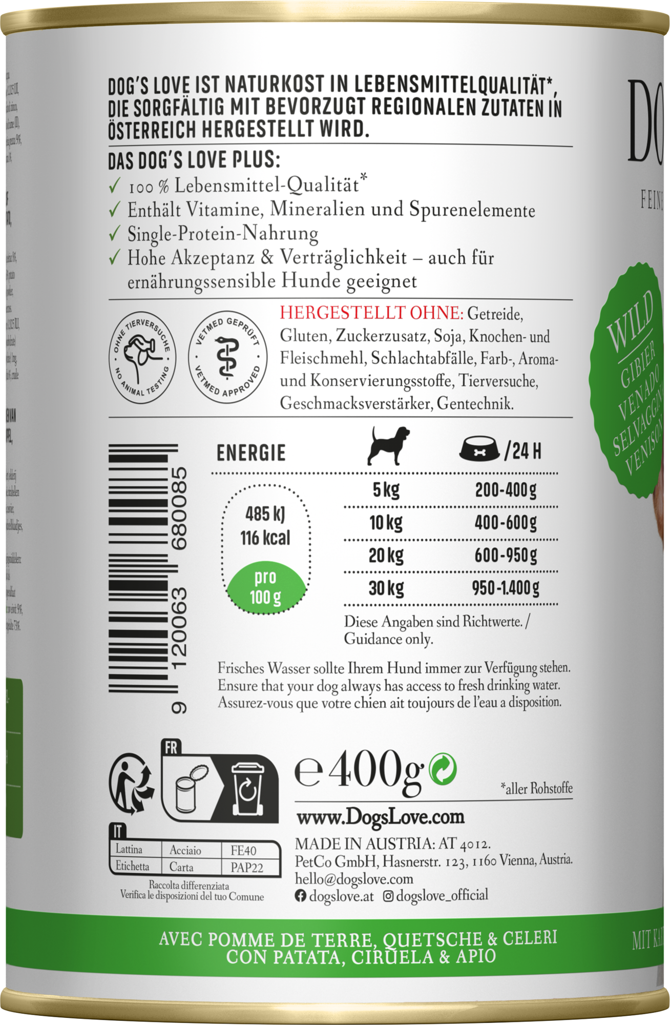 Searching for the perfect culinary delight for your dog? Look no further than Dog's Love Adult Wet Pet Food! Every bite is a symphony of high-quality, carefully selected ingredients sure to please even the most discerning palates. The tender texture of venison and roe deer meat (55%) combined with the fresh taste of potatoes, plums, and celery makes every meal a feast.