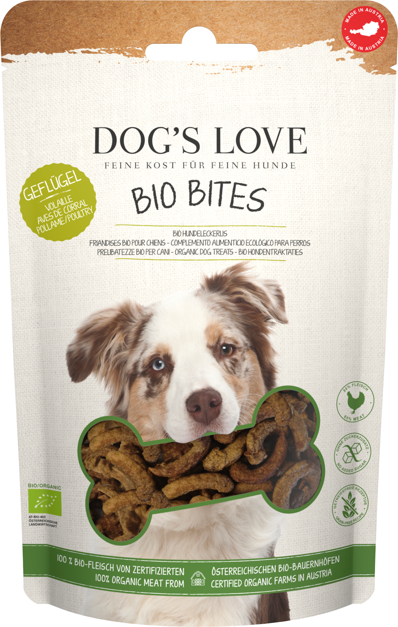The Organic Bites by Dog's Love are carefully prepared single-protein treats in organic quality. With 85% organic meat content from irresistible poultry, they serve as positive reinforcement during training or simply as a small token for rewarding well-behaved dogs.