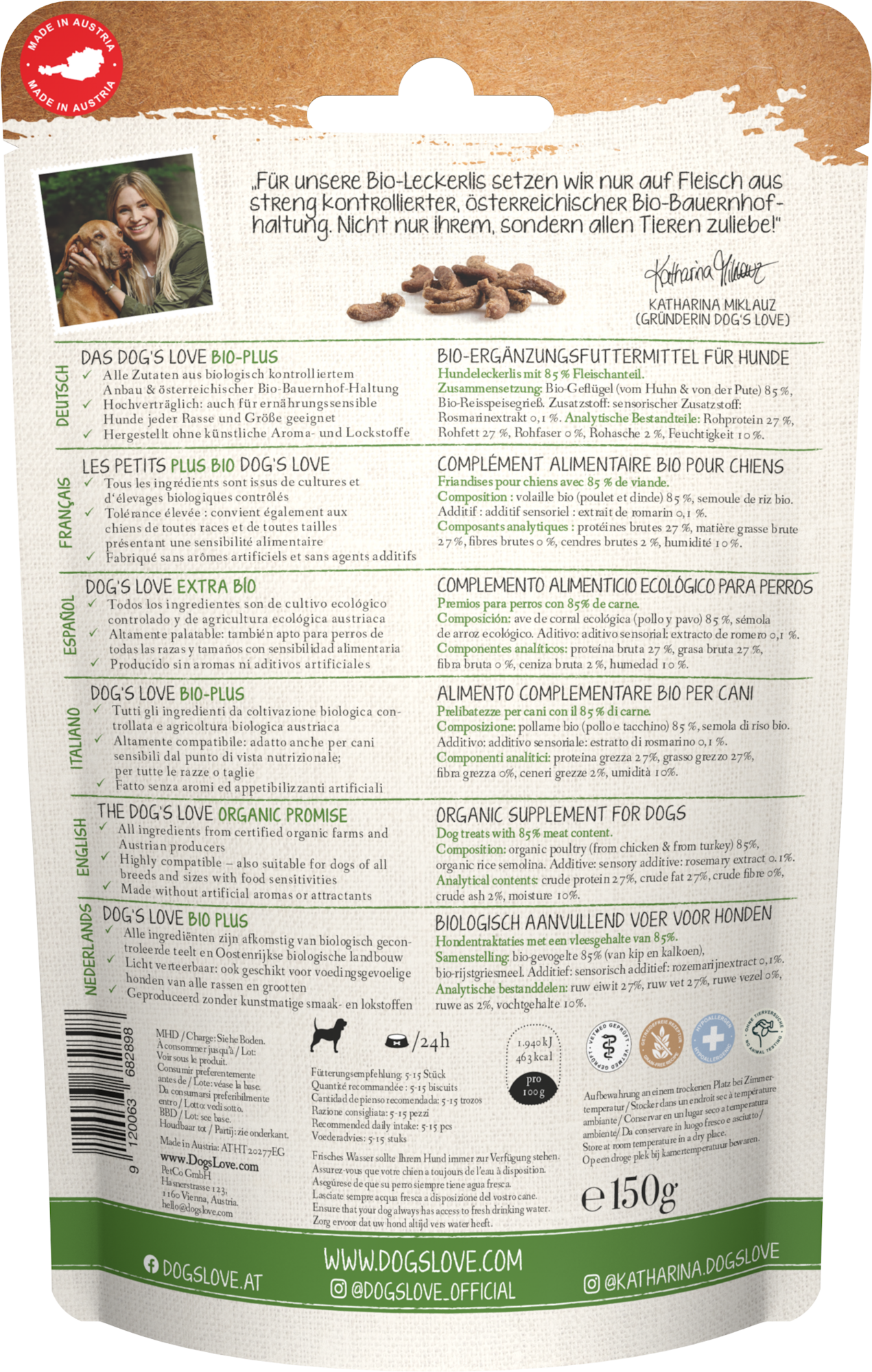 Each treat is like a little treasure, lovingly made in Austria with the finest ingredients that nature has to offer. Free from grains, gluten, added sugars, soy, bone and meat meal, slaughter by-products, colourings, flavourings, preservatives, animal testing, flavour enhancers, and GMOs.