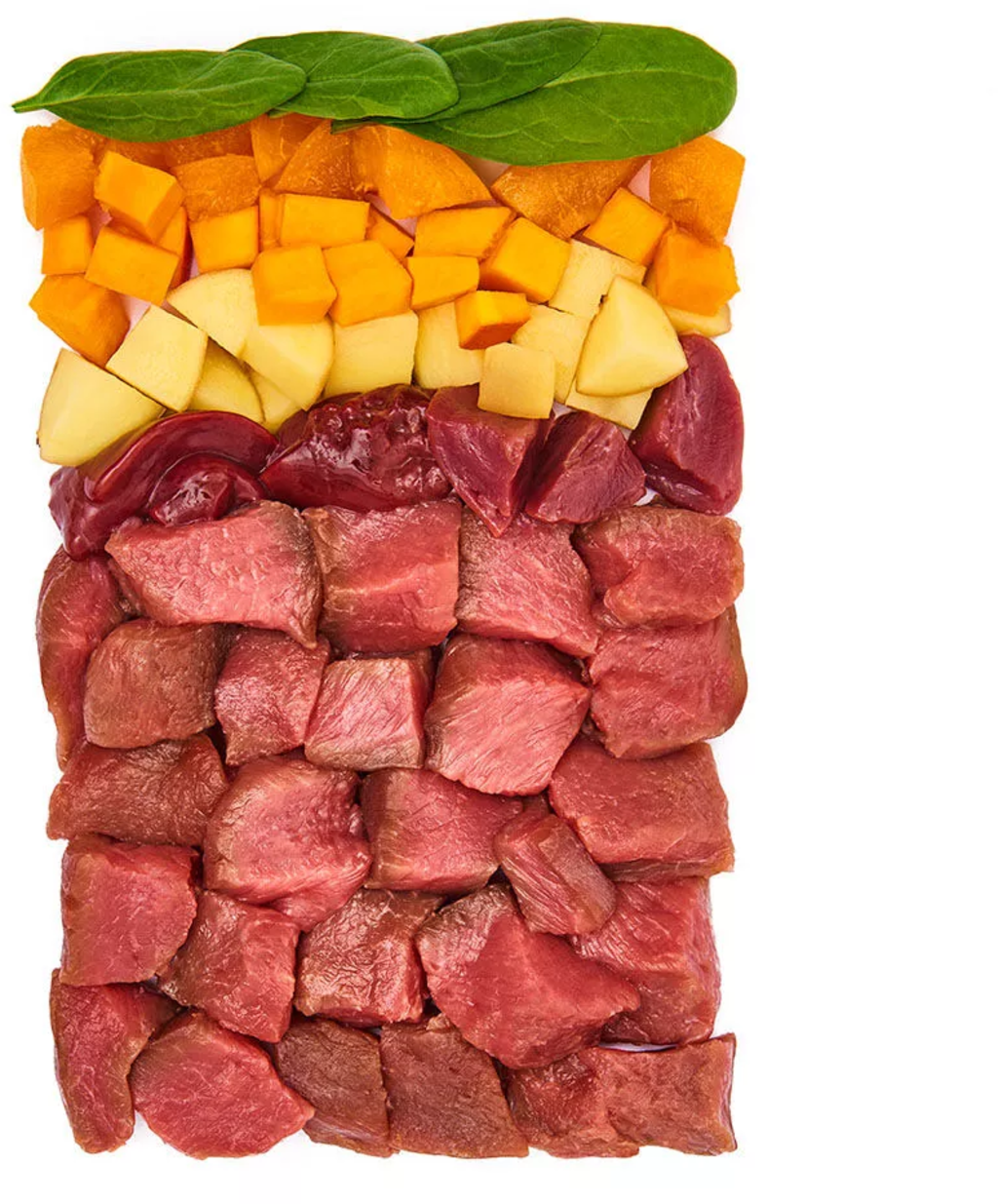 55 % Lamb meat, 11 % Potatoes, 8 % Apricots, 7 % Pumpkin, 7 % Spinach, Potato starch, Minerals, Sunflower oil, Eggshell powder, Seaweed powder, Rosehips, Dandelion leaves, Nettle leaves, Marigold flowers, Watercress