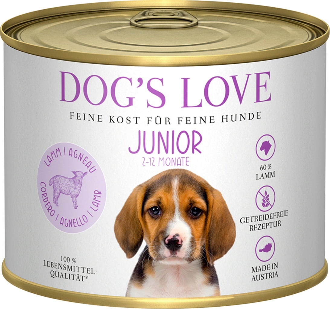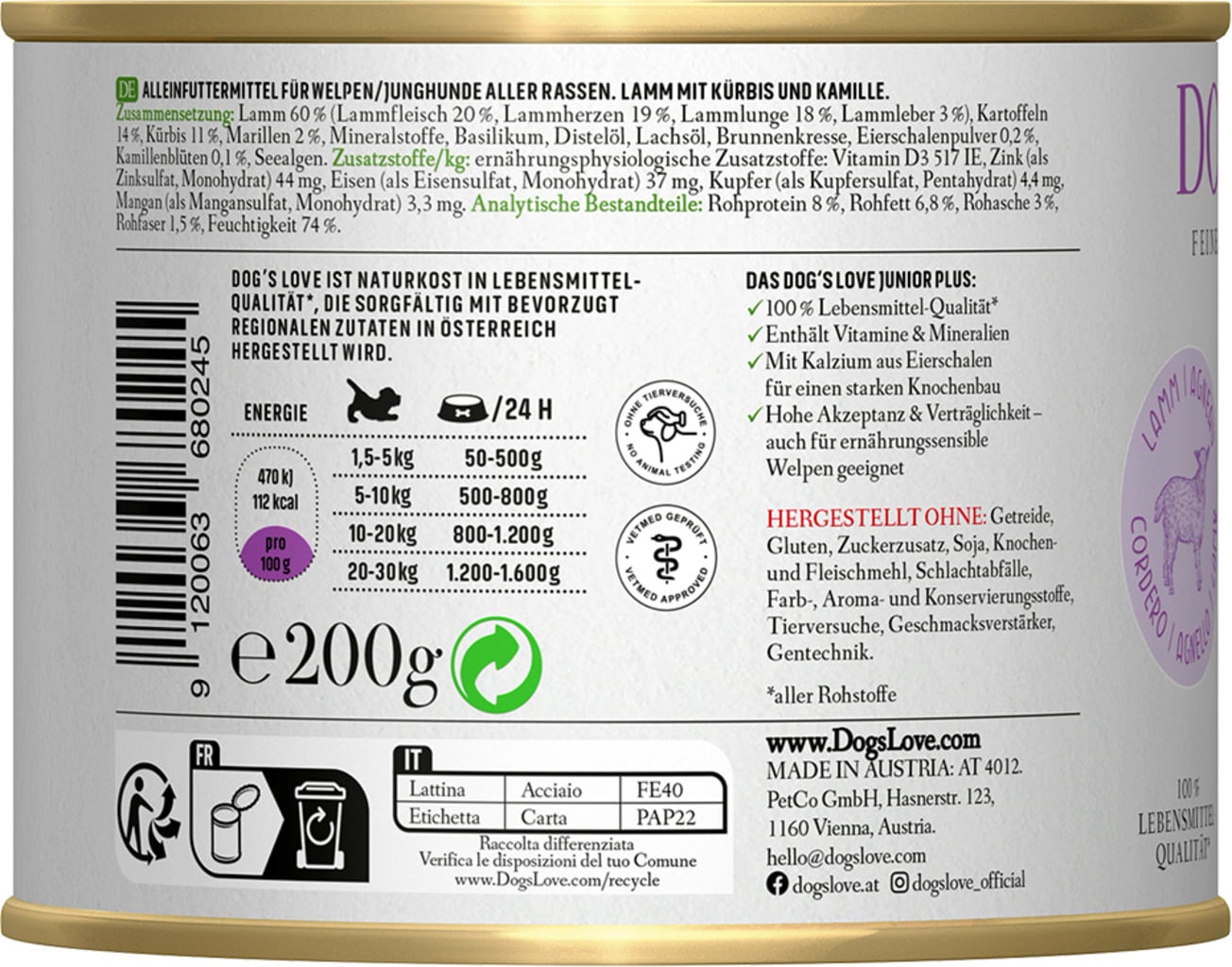 This irresistible Junior wet food by Dog's Love has been specially developed for the lively bundles of energy in the puppy and junior stages. Here, exquisite lamb meat merges with tender pieces of fruit and vegetables to create a feast for the senses. To meet the needs of growing dogs, this culinary delight is enriched with calcium from eggshells. Give your pet only the best, so they can leap into the world of adults with vigour.