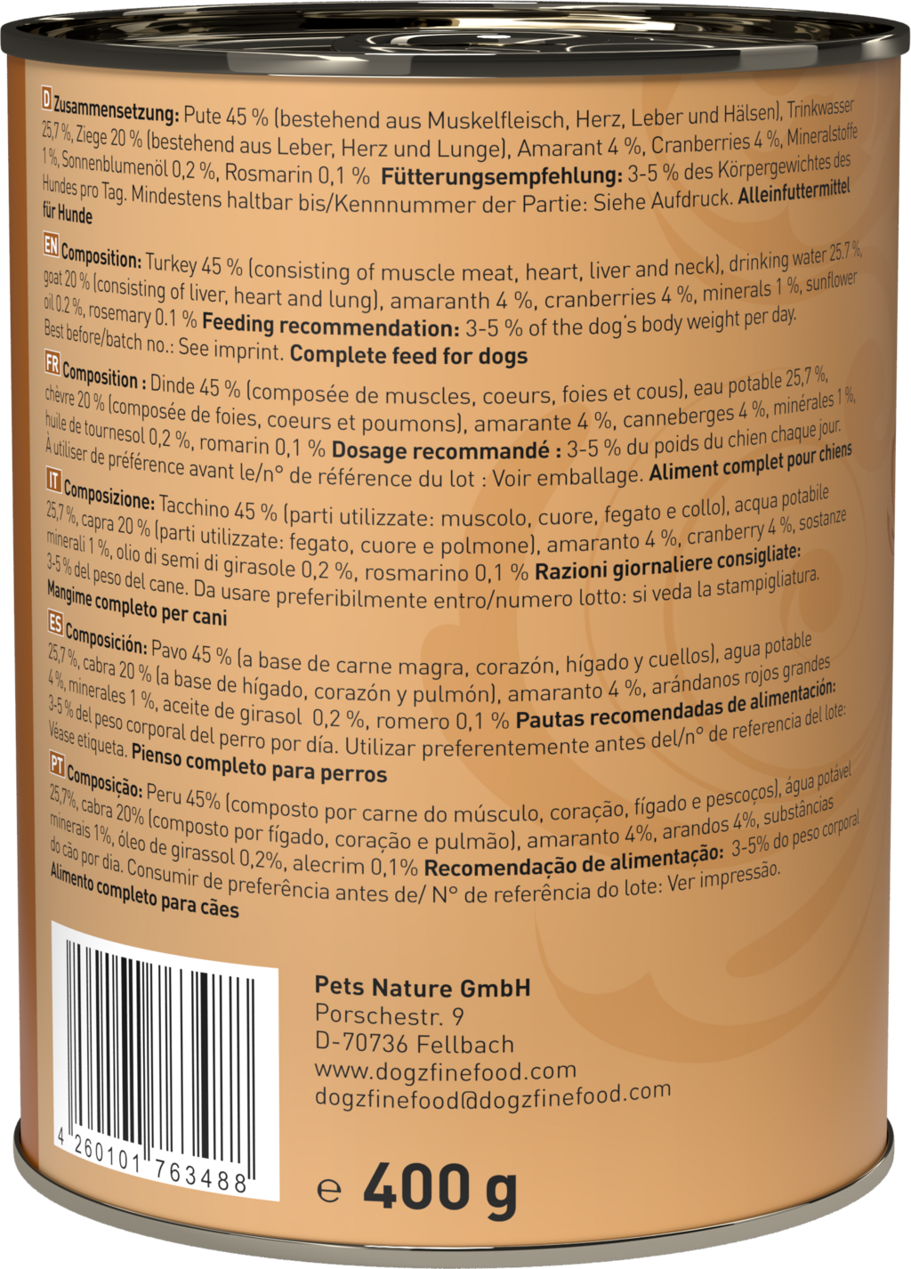 45 % Turkey (Muscle meat, Heart, Liver, Neck), 25,7 % Water, 20 % Goat (Liver, Heart, Lung), 4 % Amaranth, 4 % Cranberries, 1 % Minerals, 0,2 % Sunflower oil, 0,1 % Rosemary
