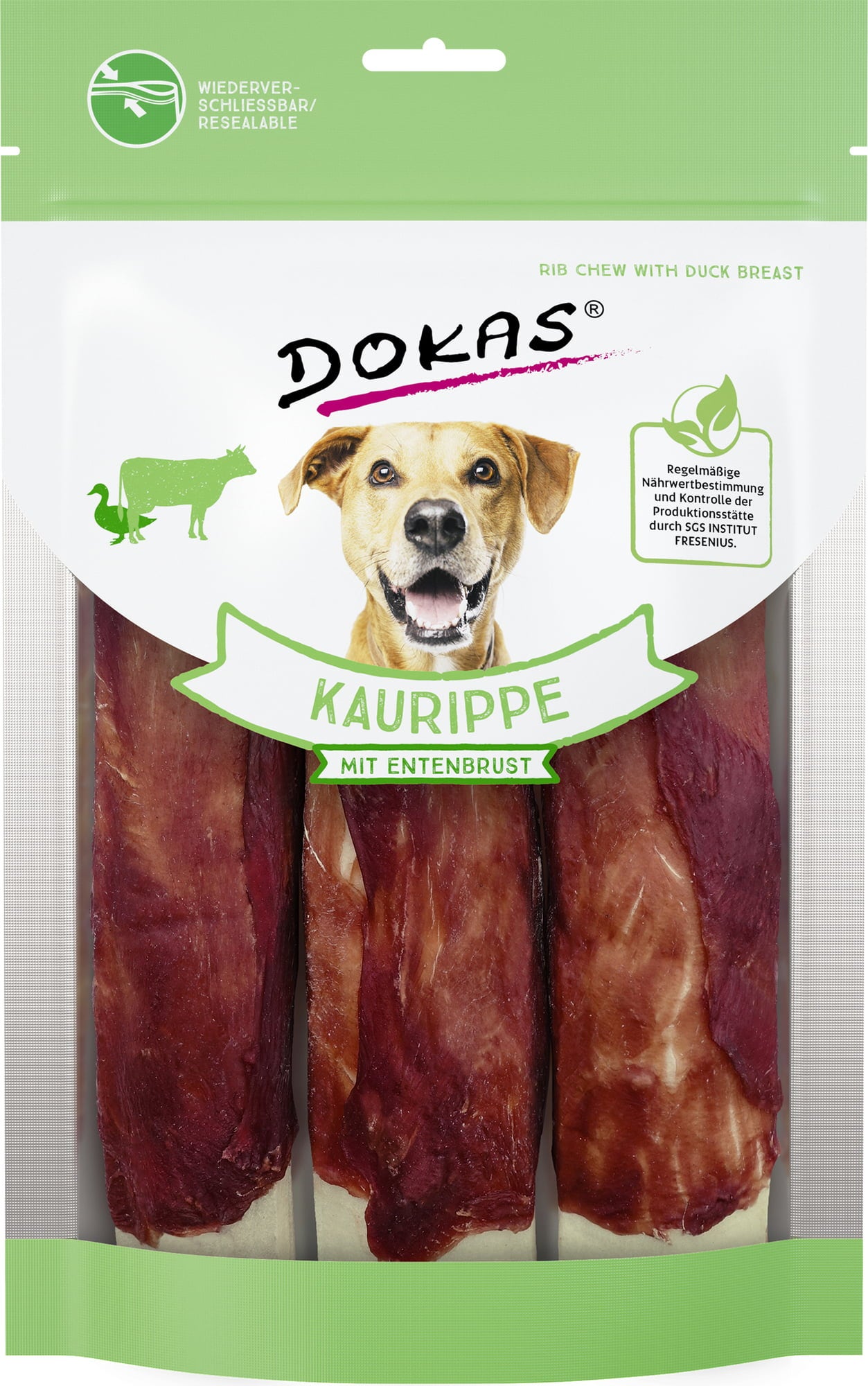 The chew rib by Dokas is made of beef hide, coated with fine duck breast fillet. An enormous chewing delight that serves as the perfect reward for your pet. Intense chewing strengthens muscles and can contribute to daily dental care.