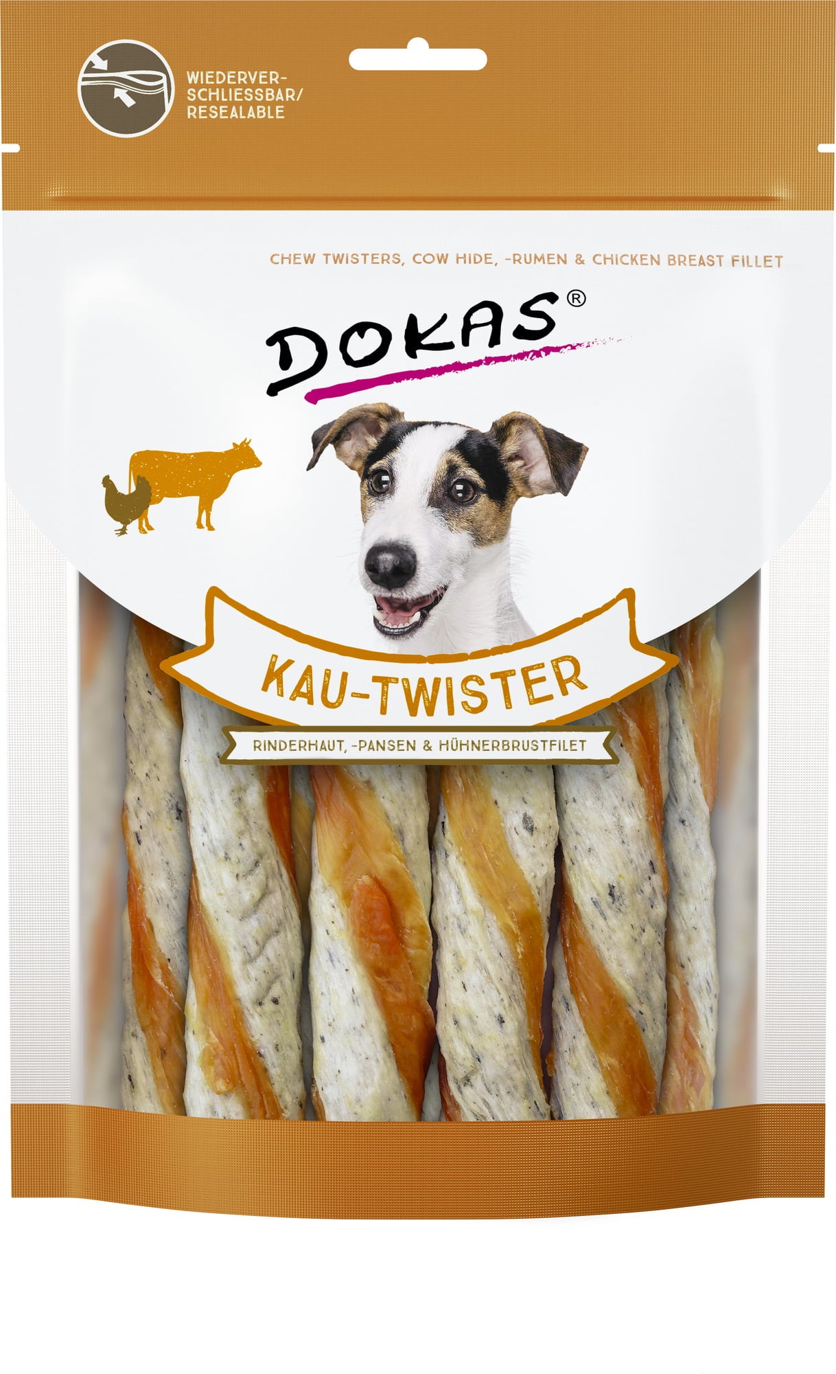 The Chew Twister by Dokas is made from beef hide, beef tripe, and chicken breast fillet, offering a particularly delightful chewing experience. Intense chewing also strengthens the muscles and can support daily dental care.