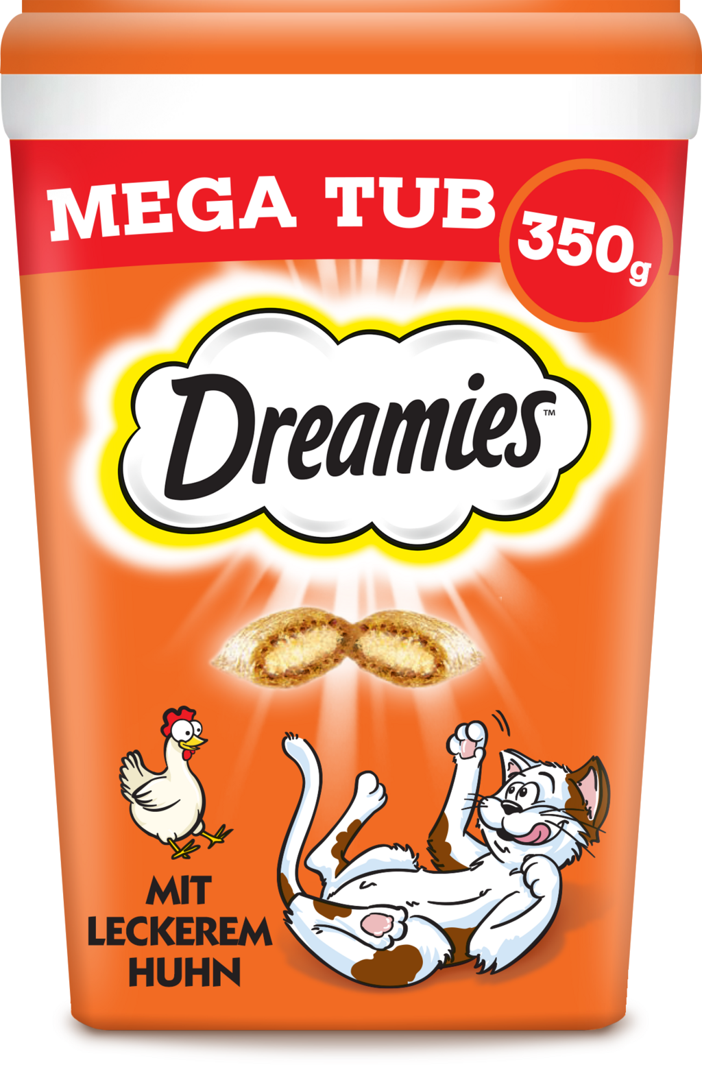 The chickens may not have been amused, but your cat will be: Dreamies Chicken are crispy baked snacks filled with irresistible chicken cream. The recipe includes carefully selected ingredients and smart additions like antioxidants, vitamins, and minerals. At Zoolini, you can indulge in a mega pack: The practical tub (Mega Tub) contains 350 g of Dreamies - perfect for a household with multiple cats!
