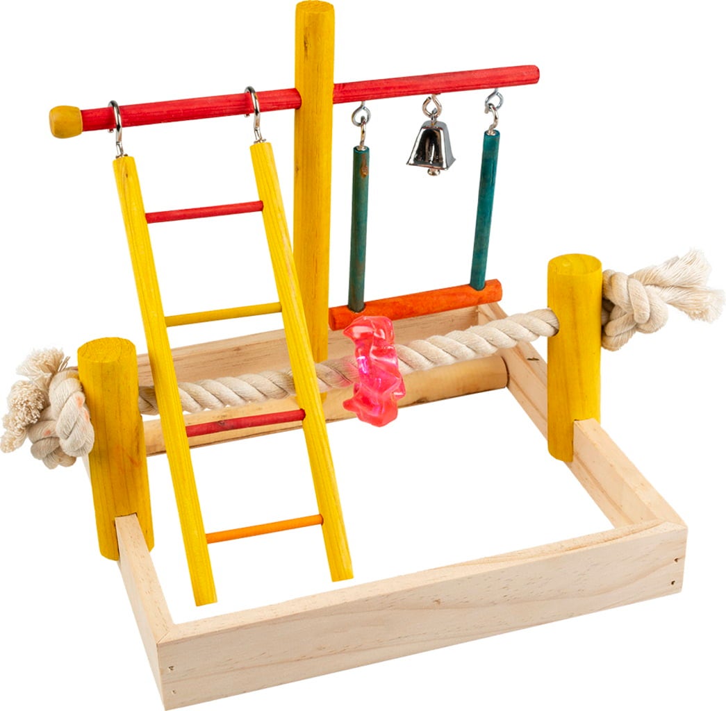 With the Duvoplus Pino bird playground, your bird will never be bored again. This interactive toy encourages your bird to play, climb, and stay active. It is made of natural wood and painted with animal-friendly paint. The Pino features various toys, including a ladder, a rope play train and a swing with a bell. It is the ideal gift to your bird to help foster its acrobatic talents. The Pino Playground is suitable for small to medium-sized birds. For indoor use only. Wipe the playground regularly with a damp cloth to keep it clean. Add variety and fun to your feathered friend's daily routine with this playground!
