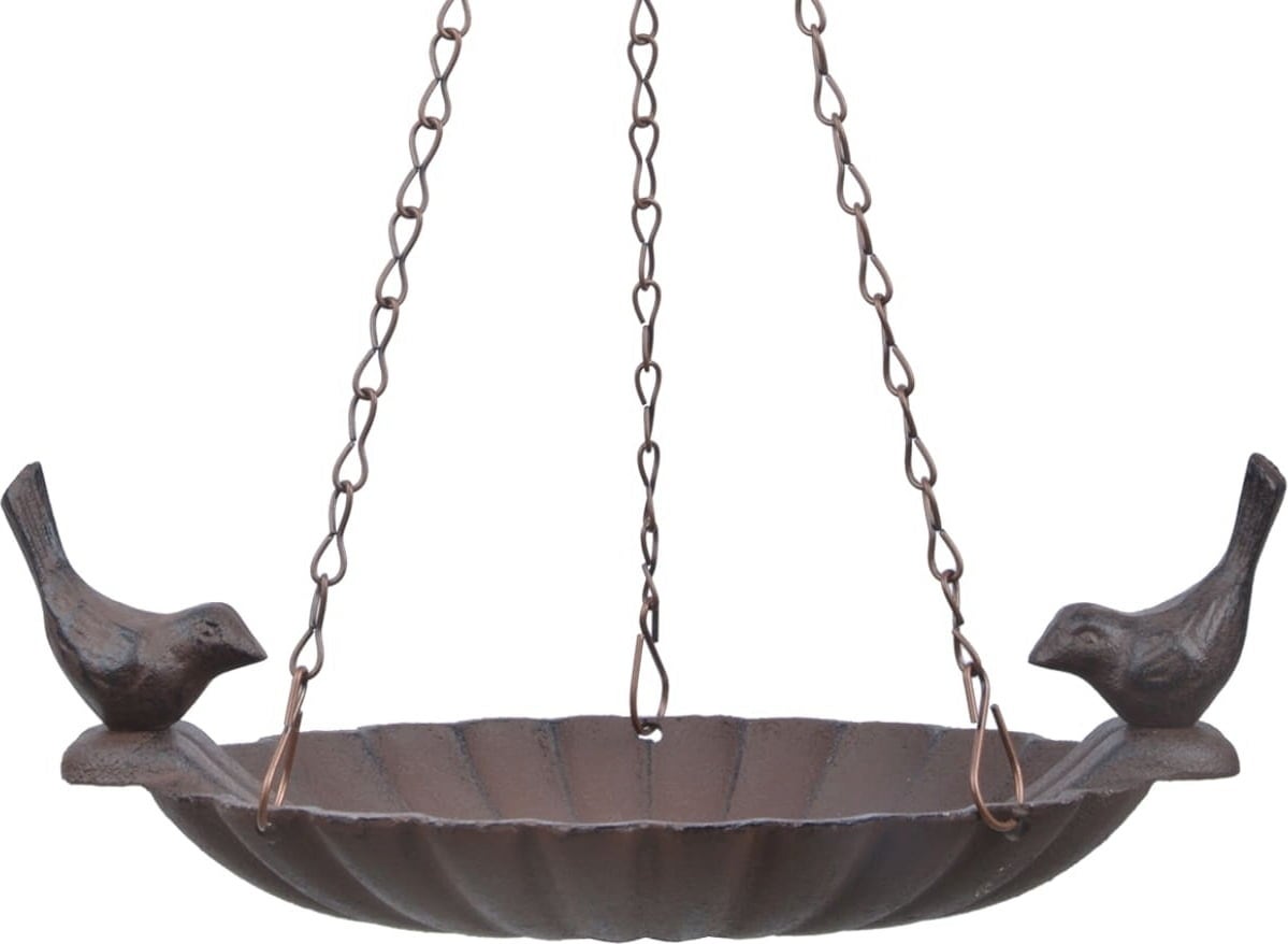 This beautiful bird bath made of sturdy cast iron offers thirsty birds a cosy resting place. With the chain and suspension hook, it can be easily mounted on a tree, a beam or the ceiling. However, the place chosen must be quiet and inaccessible to cats. By the way, birds use a drinking trough filled with water for drinking and a relaxing bath.