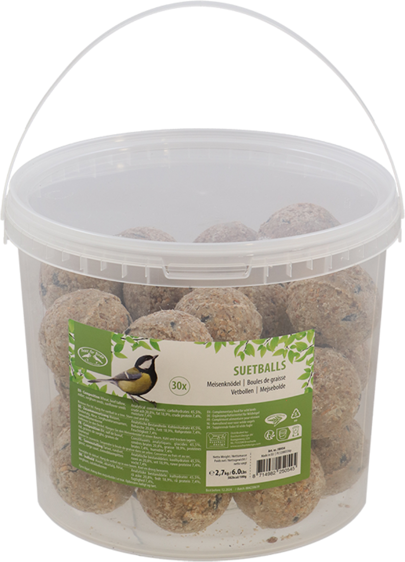 This bucket contains 30 suet balls, which are a nutritious source of food for wild birds in winter and will attract lots of birds to your garden.