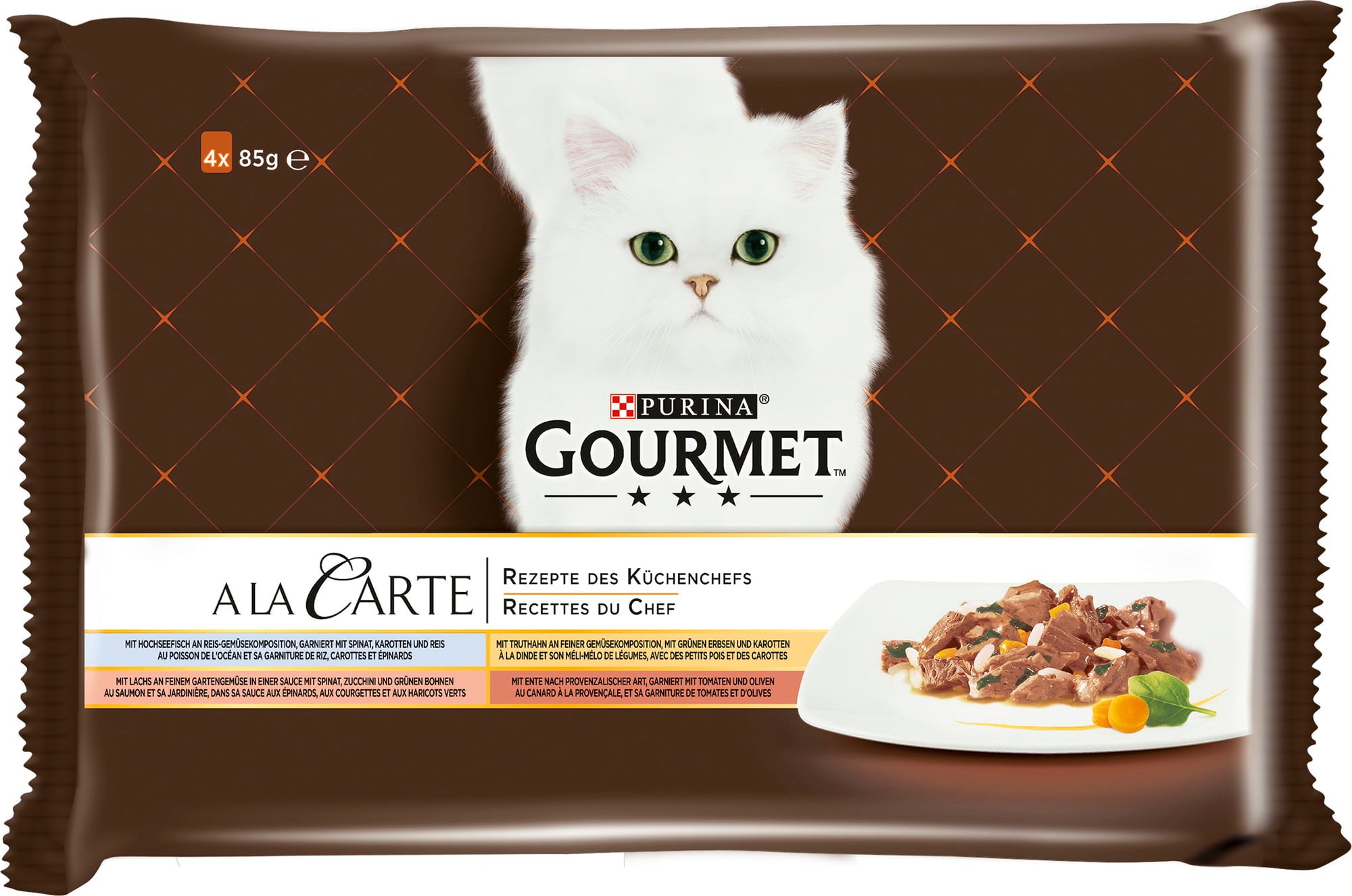 Gourmet A la Carte is the ultimate choice for discerning cats. Inspired by the GOURMET chef, this range offers a unique selection of exquisite creations. The pack contains the following four flavours: