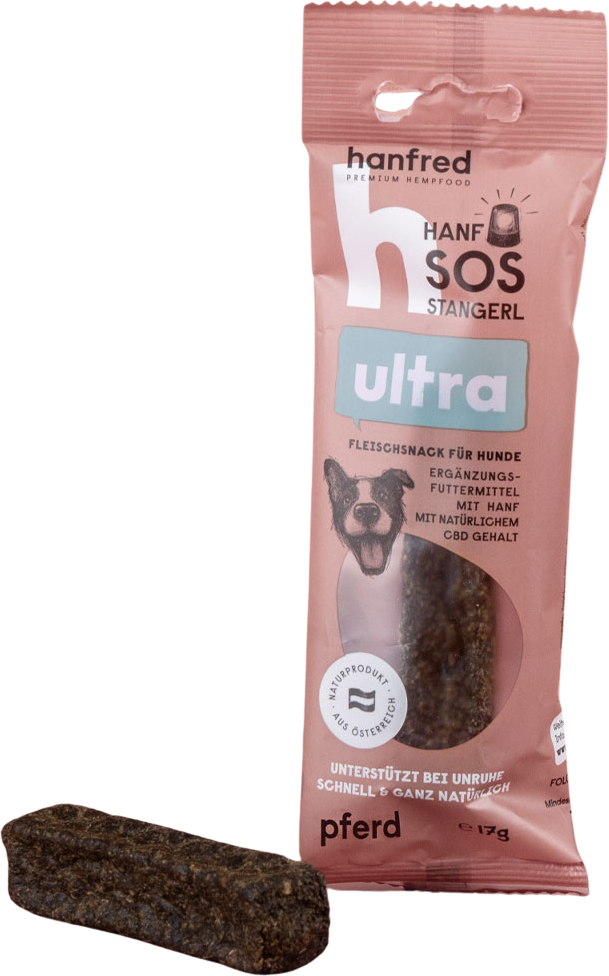 The SOS Ultra Sticks contain 25% hemp and are a complementary feed for your dog – especially useful when travelling or in unfamiliar situations. Made from juicy meat and hemp powder, with no unnecessary additives.