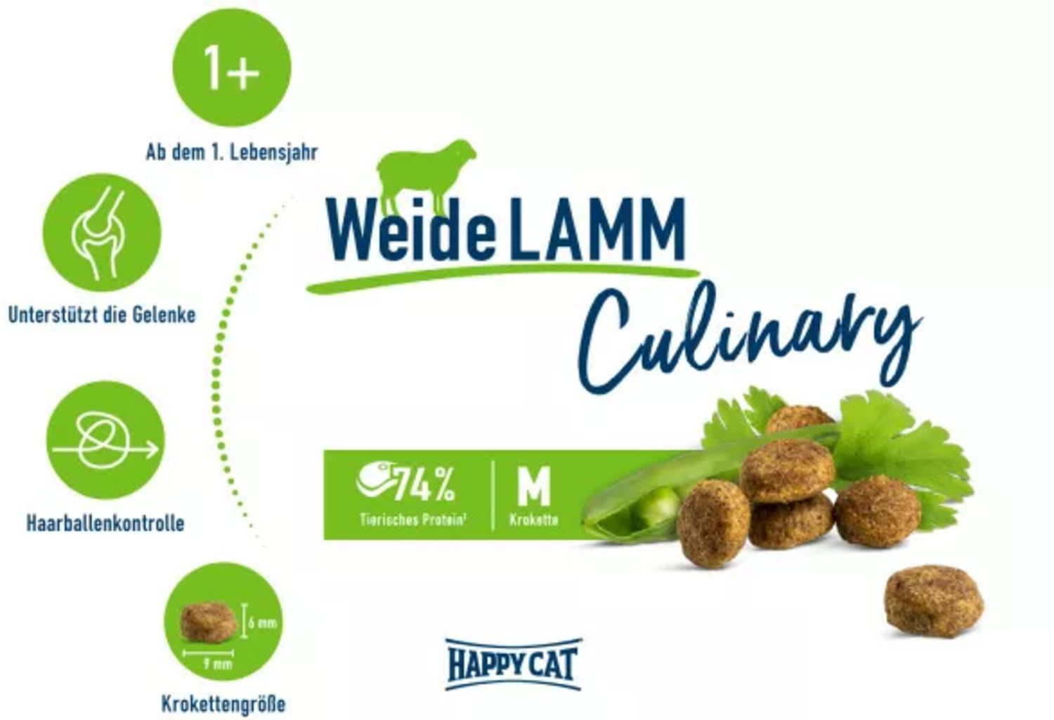 The Happy Cat Dry Food is suitable for mixed feeding. Use two parts wet food to one part dry pet food for total feeding. You can offer the wet food twice daily (e.g. morning and evening), while the dry pet food can be left in the bowl during the day for your cat to nibble on. Always serve plenty of fresh water with meals.