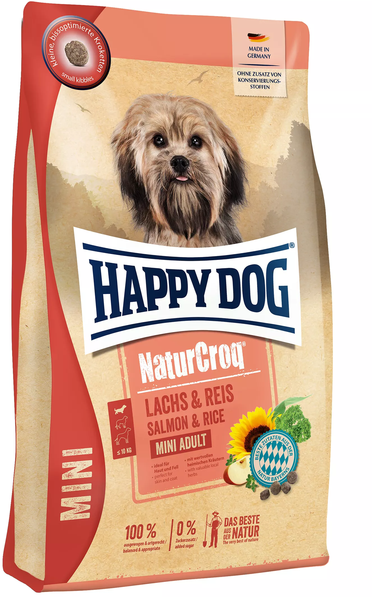 NaturCroq Mini dry food spoils hungry pets with delicacies from the Bavarian region. Delicious salmon and easily digestible rice not only provide a special treat, but also contain valuable protein, B vitamins and minerals. The tasty recipe is rounded off with selected local herbs.