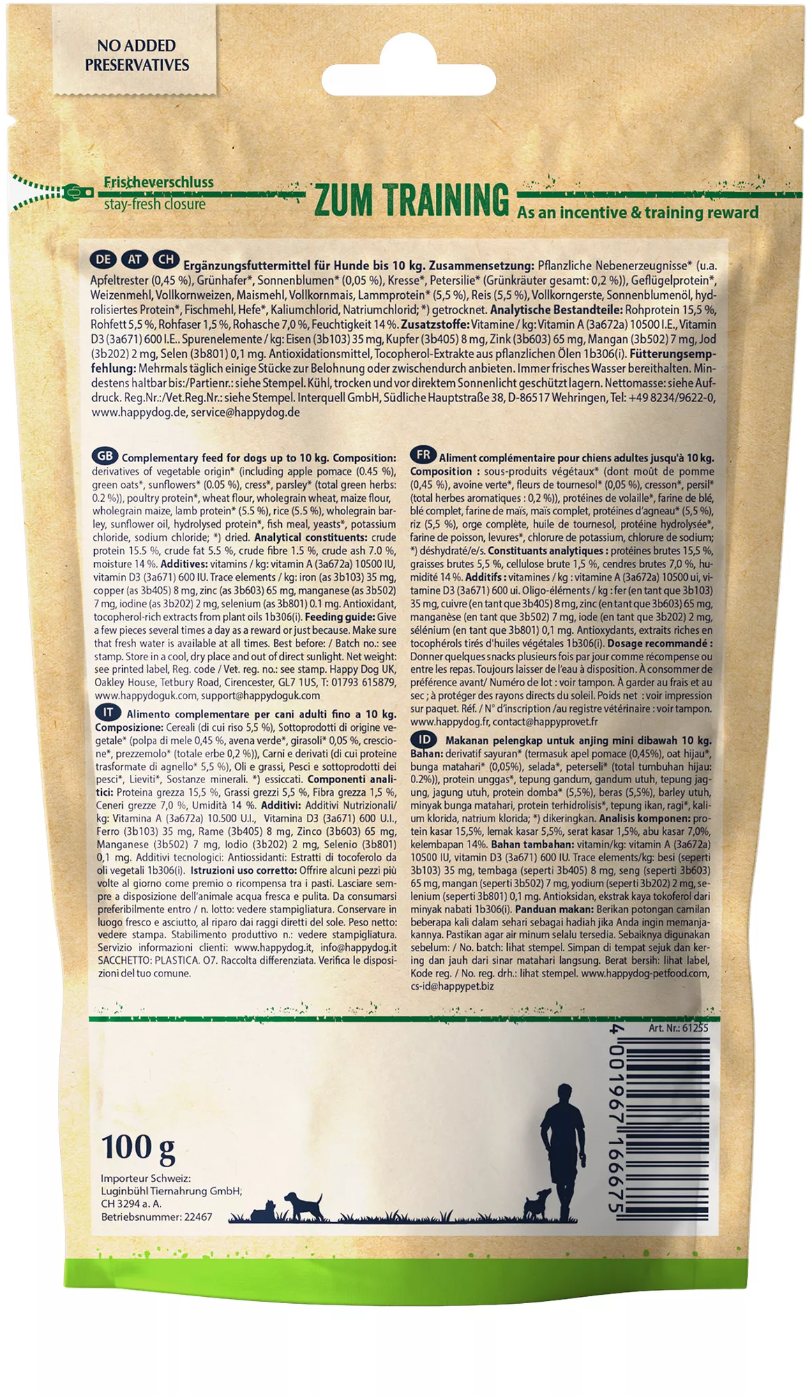 The relatively small size of the kibble (10 x 13 mm) can be easily divided in the middle, making the snacks ideal for longer training sessions.