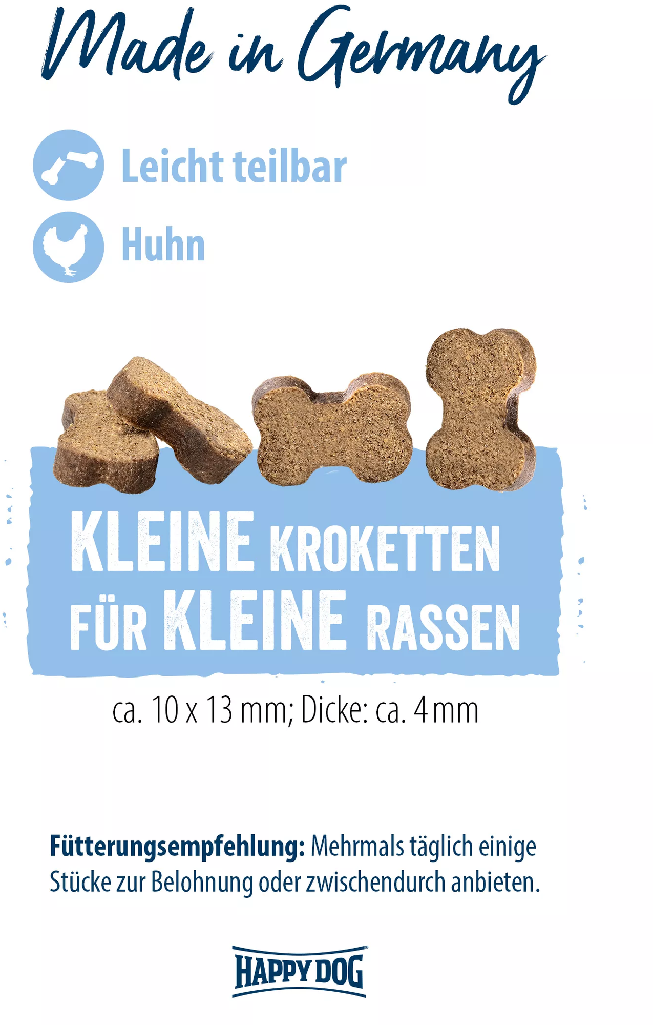 The small croquettes (10 x 13 mm) can easily be divided in half, making the snacks ideal for longer training sessions.